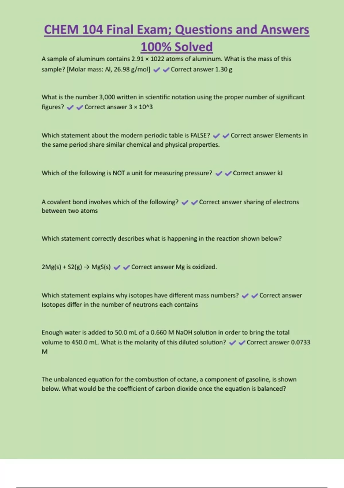 CHEM 104 Final Exam; Questions and Answers 100% Solved A sample of aluminum contains 2.91 × 1022 atoms of aluminum. What is the mass of this sample? [Molar mass: Al, 26.98 g/mol] Correct answer 1.30 g What is the number 3,000 written in scientific notation using the proper number of significant figures? Correct answer 3 × 10^3 Which statement about the modern periodic table is FALSE? Correct answer Elements in the same period share similar chemical and physical propertie
