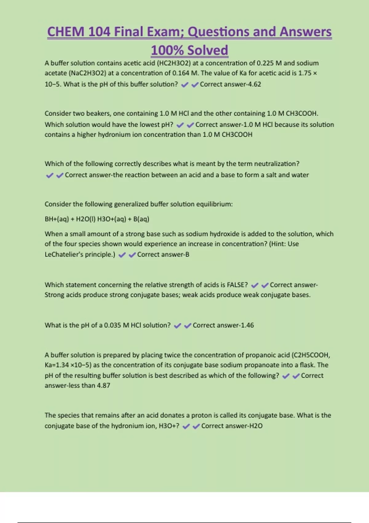 CHEM 104 Final Exam ; Questions and Answers 100% Solved A buffer solution contains acetic acid (HC2H3O2) at a concentration of 0.225 M and sodium acetate (NaC2H3O2) at a concentration of 0.164 M. The value of Ka for acetic acid is 1.75 × 10−5. What is the pH of this buffer solution? Correct answer -4.62 Consider two beakers, one containing 1.0 M HCl and the other containing 1.0 M CH3COOH. Which solution would have the lowest pH? Correct answer -1.0 M HCl because its solution contains a higher hydronium ion concentration than 1.0 M CH3COOH Which of the following correctly describes what is meant by the term neutralization? Correct answer -the reaction between an acid and a base to form a salt and water Consider the following generalized buffer solution equilibrium: BH+(aq) + H2O(l) H3O+(aq) + B(aq) When a small amount of a strong base such as sodium hydroxide is added to the solution, which of the four species shown would experience an increase in concentration? (Hint: Use LeChatelier's principle.) Correct answer -B Which statement concerning the relative strength of acids is FALSE? Correct answer -