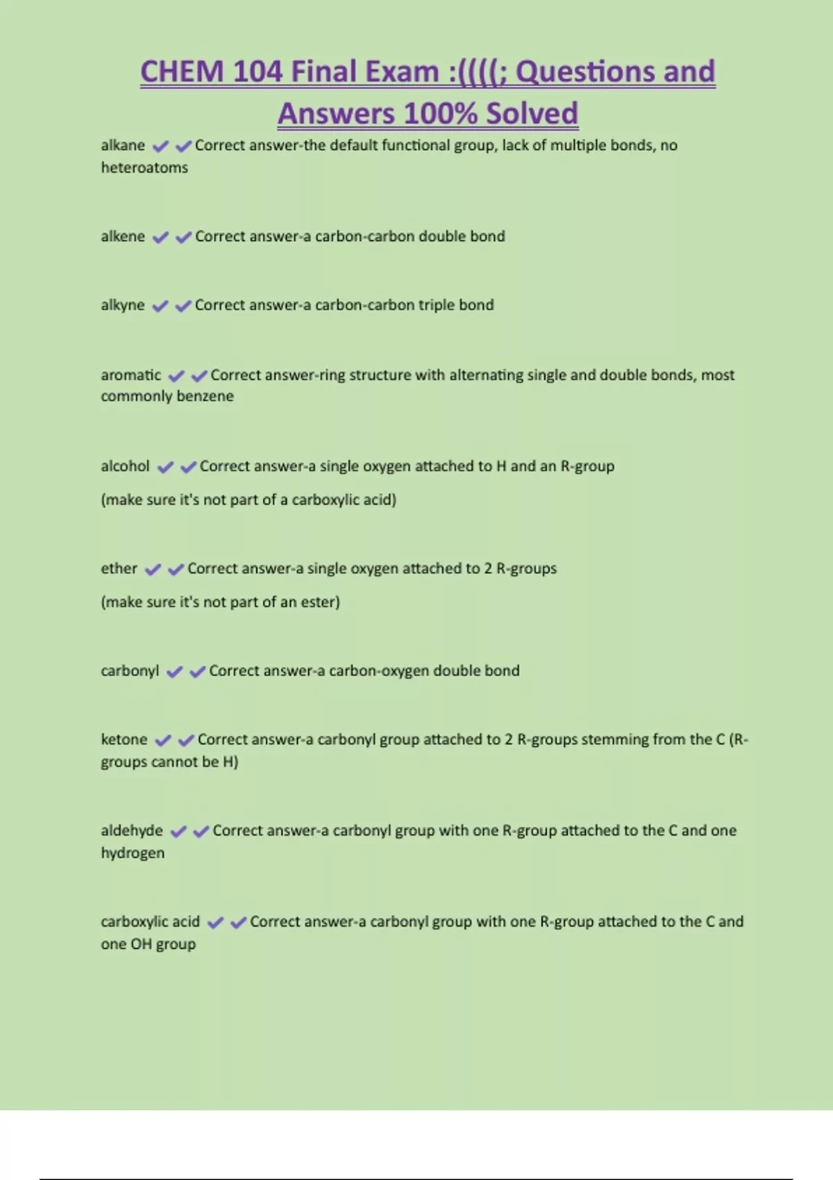 CHEM 104 Final Exam :((((; Questions and Answers 100% Solved alkane Correct answer-the default functional group, lack of multiple bonds, no heteroatoms alkene Correct answer-a carbon-carbon double bond alkyne Correct answer-a carbon-carbon triple bond aromatic Correct answer-ring structure with alternating single and double bonds, most commonly benzene alcohol Correct answer-a single oxygen attached to H and an R-group (make sure it's not part of a carboxylic acid