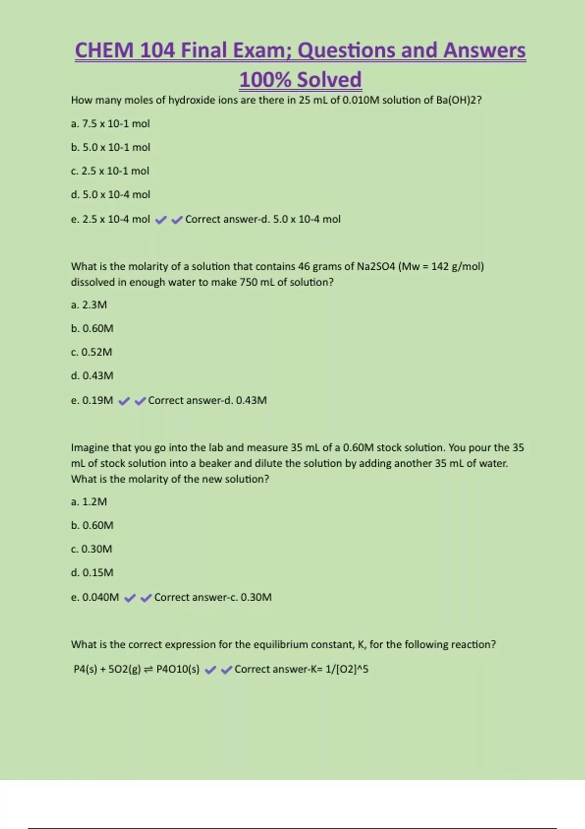 CHEM 104 Final Exam; Questions and Answers 100% Solved How many moles of hydroxide ions are there in 25 mL of 0.010M solution of Ba(OH)2? a. 7.5 x 10-1 mol b. 5.0 x 10-1 mol c. 2.5 x 10-1 mol d. 5.0 x 10-4 mol e. 2.5 x 10-4 mol Correct answer-d. 5.0 x 10-4 mol What is the molarity of a solution that contains 46 grams of Na2SO4 (Mw = 142 g/mol) dissolved in enough water to make 750 mL of solution? a. 2.3M b. 0.60M c. 0.52M d. 0.43M e. 0.19M Correct answer-d. 0.43M