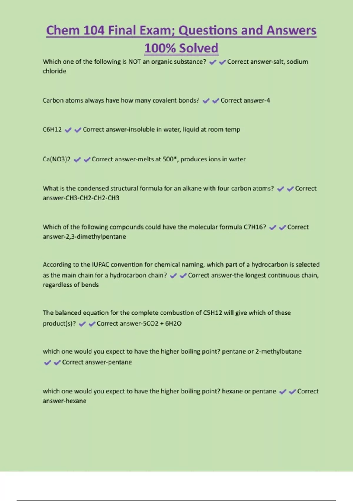 Chem 104 Final Exam; Questions and Answers 100% Solved Which one of the following is NOT an organic substance? Correct answer-salt, sodium chloride Carbon atoms always have how many covalent bonds? Correct answer-4 C6H12 Correct answer-insoluble in water, liquid at room temp Ca(NO3)2 Correct answer-melts at 500*, produces ions in water What is the condensed structural formula for an alkane with four carbon atoms? Correct answer-CH3-CH2-CH2-CH3 Which of the following compounds could have the molecular formula C7H16? Correct answer-2,3-dimethylpentane