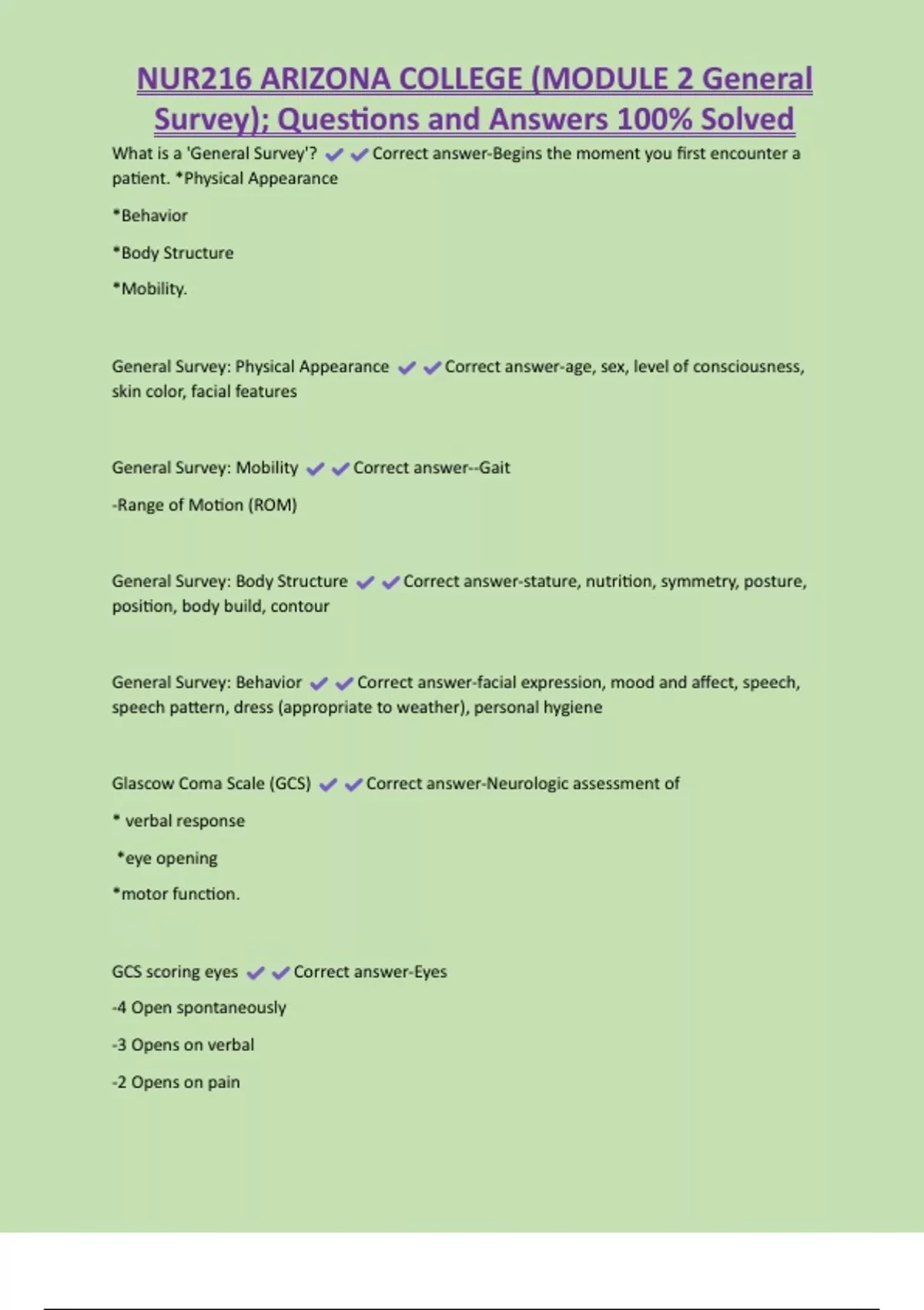 NUR216 ARIZONA COLLEGE (MODULE 2 General Survey); Questions and Answers 100% Solved What is a 'General Survey'? Correct answer-Begins the moment you first encounter a patient. *Physical Appearance *Behavior *Body Structure *Mobility. General Survey: Physical Appearance Correct answer-age, sex, level of consciousness, skin color, facial features General Survey: Mobility Correct answer--Gait -Range of Motion (ROM)