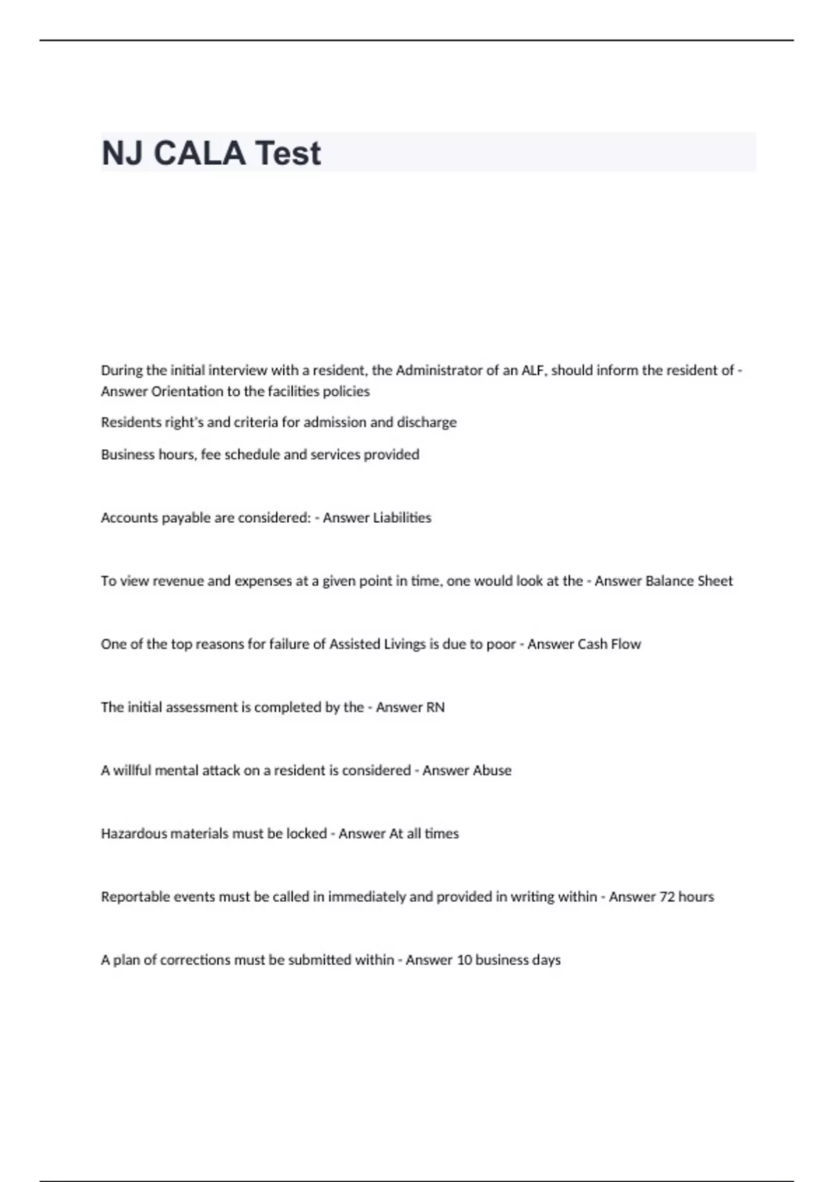 NJ CALA Test Questions with 100% Correct Answers