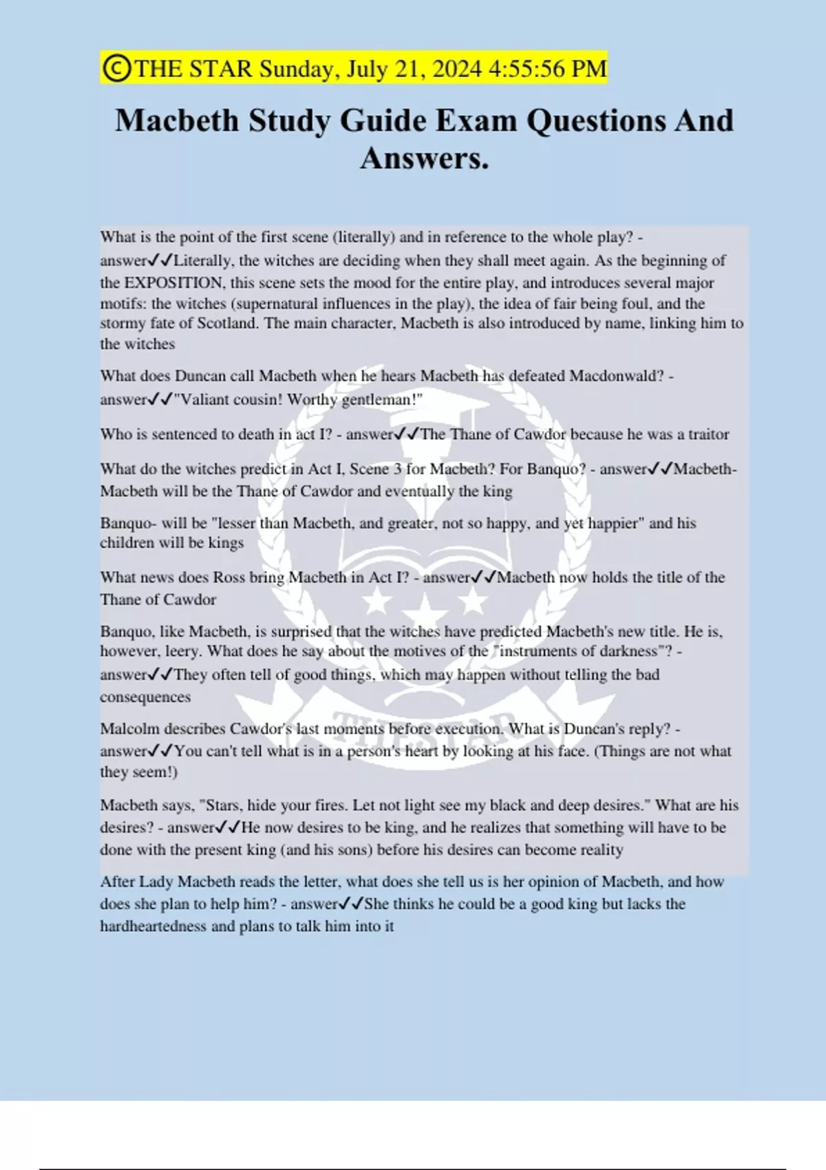 Macbeth Study Guide Exam Questions And Answers.