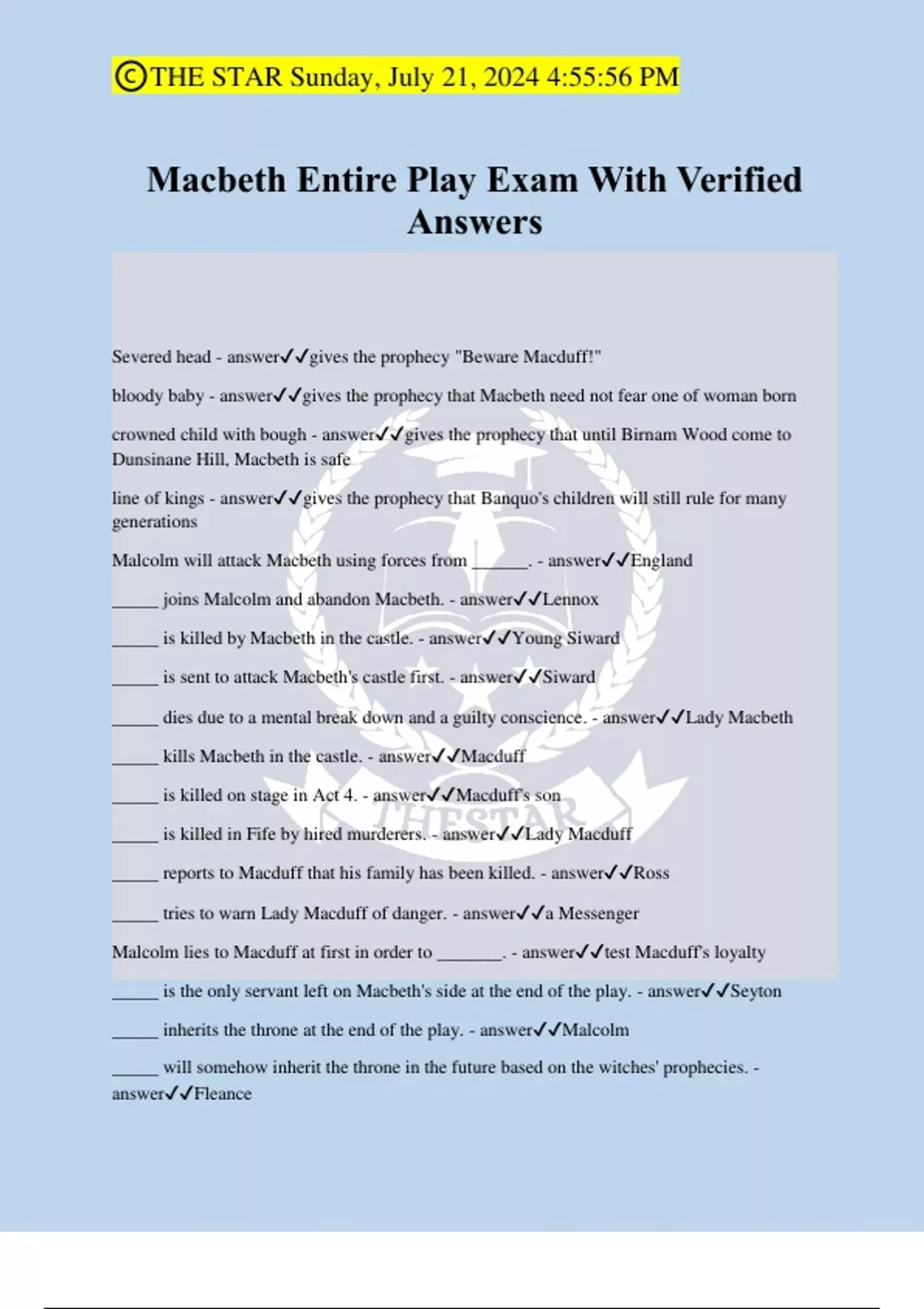 Macbeth Entire Play Exam With Verified Answers Severed head - answergives the prophecy "Beware Macduff!" bloody baby - answergives the prophecy that Macbeth need not fear one of woman born crowned child with bough - answergives the prophecy that until Birnam Wood come to Dunsinane Hill, Macbeth is safe line of kings - answergives the prophecy that Banquo's children will still rule for many generations Malcolm will attack Macbeth using forces from ______. - answerEngland _____ joins Malcolm and abandon Macbeth. - answerLennox _____ is killed by Macbeth in the castle. - answerYoung Siward _____ is sent to attack Macbeth's castle first. - answerSiward _____ dies due to a mental break down and a guilty conscience. - answerLady Macbeth _____ kills Macbeth in the castle. - answerMacduff _____ is killed on stage in Act 4. - answerMacduff's son _____ is killed in Fife by hired murderers. - answerLady Macduff _____ reports to Macduff that his family has been killed. - answerRoss _____ tries to warn Lady Macduff of danger. - answera Messenger Malcolm lies to Macduff at first in order to _______. - answertest Macduff's loyalty _____ is the only servant left on Macbeth's side at the end of the play. - answerSeyton _____ inherits the throne at the end of the play. - answerMalcolm _____ will somehow inherit the throne in the future based on the witches' prophecies. - answerFleance