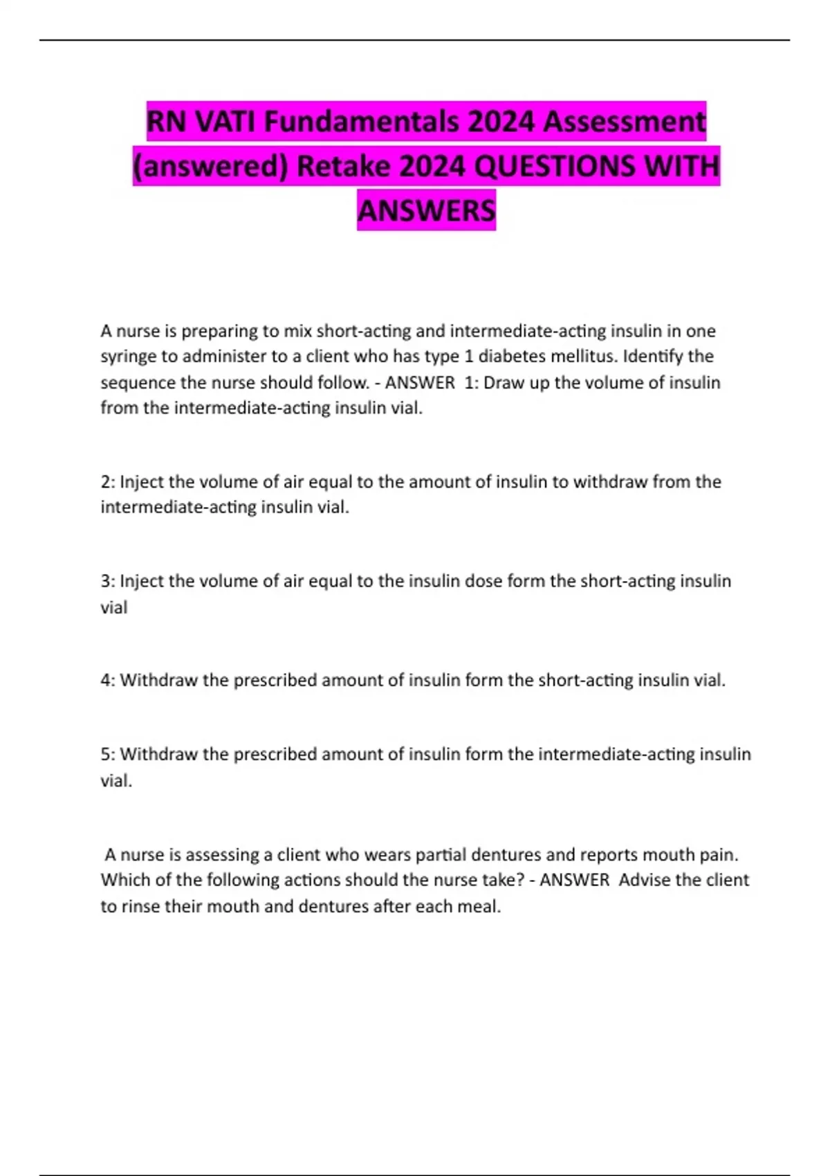 RN VATI Fundamentals 2024 Assessment (answered) Retake 2024 QUESTIONS WITH ANSWERS A nurse is planning care for a client who has dysphagia and is at risk for aspiration. Which of the following referrals should the nurse make? - ANSWER Speech-language pathologist A nurse is planning teaching for a client who has a New diagnosis of type 2 diabetes mellitus. Which of the following actions should the nurse take prior to performing the teaching? (select all that apply) - ANSWER - Establish the client's learning needs - Determine the client's literacy level - Evaluate the client's readiness for learning - Identify the client's learning style A nurse is preparing to notify the provider about a change in a client's status. Which of the following information should the nurse plan to include in the "background" portion of the SBAR communication tool? - ANSWER Previous treatments A nurse is providing discharge teaching to a client who has a new prescription for home oxygen therapy utilizing a compressed oxygen system. Which of the following statements by the client indicates an understanding of the teaching? - ANSWER "I will store oxygen tanks in an upright position" A nurse is caring for a client who has terminal cancer The client begins to cry and says, "I am afraid of dying." Which of the following responses should the nurse make? - ANSWER "It must me a very difficult time for you
