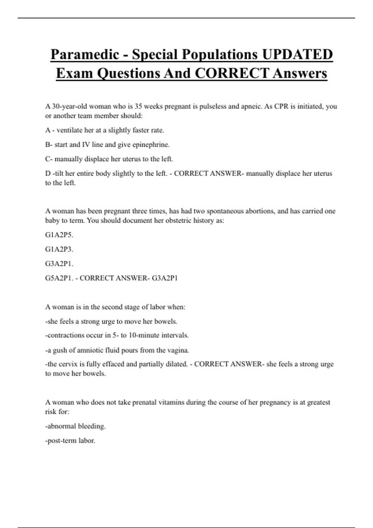 Paramedic - Special Populations UPDATED Exam Questions And CORRECT Answers A 30-year-old woman who is 35 weeks pregnant is pulseless and apneic. As CPR is initiated, you or another team member should: A - ventilate her at a slightly faster rate. B- start and IV line and give epinephrine. C- manually displace her uterus to the left. D -tilt her entire body slightly to the left. - CORRECT ANSWER- manually displace her uterus to the left. A woman has been pregnant three times, has had two spontaneous abortions, and has carried one baby to term. You should document her obstetric history as: