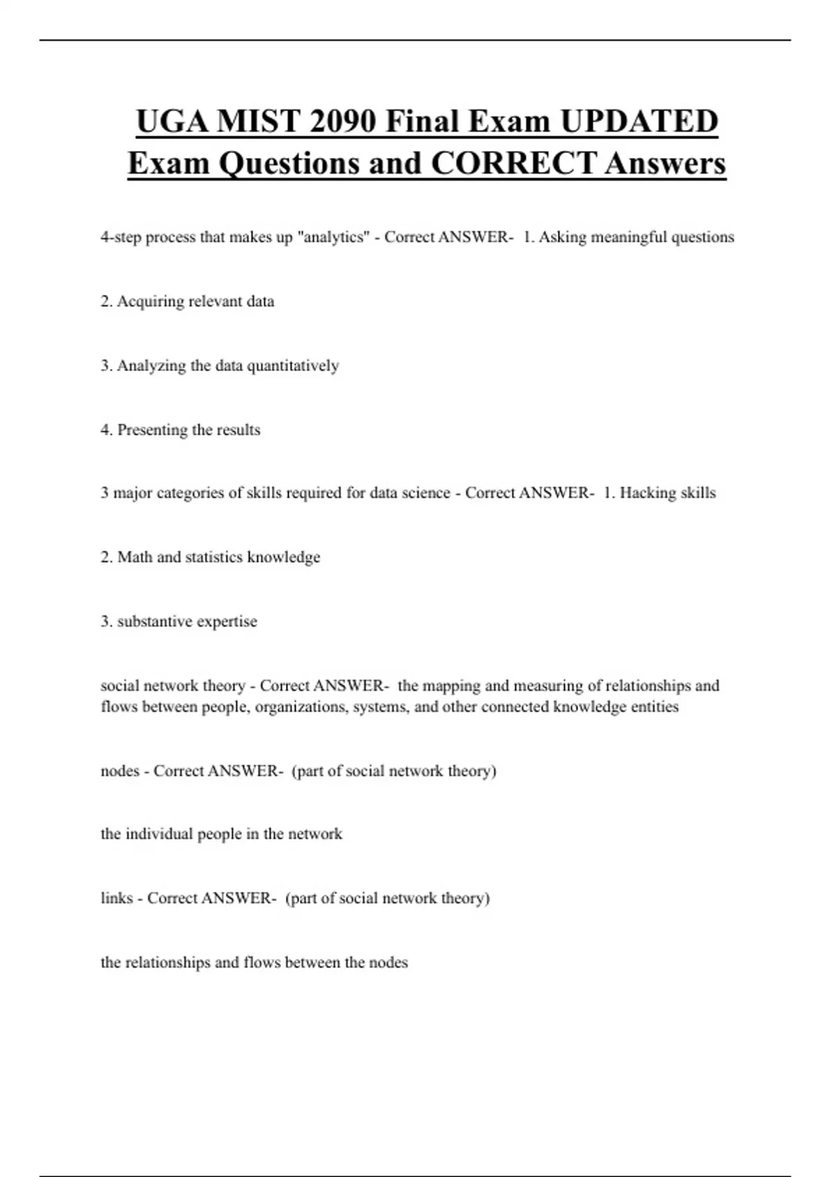 UGA MIST 2090 Final Exam UPDATED Exam Questions and CORRECT Answers 4-step process that makes up "analytics" - Correct ANSWER- 1. Asking meaningful questions 2. Acquiring relevant data 3. Analyzing the data quantitatively 4. Presenting the results 3 major categories of skills required for data science - Correct ANSWER- 1. Hacking skills 2. Math and statistics knowledge