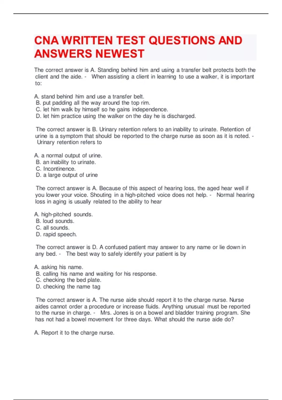 CNA WRITTEN TEST QUESTIONS AND ANSWERS NEWEST