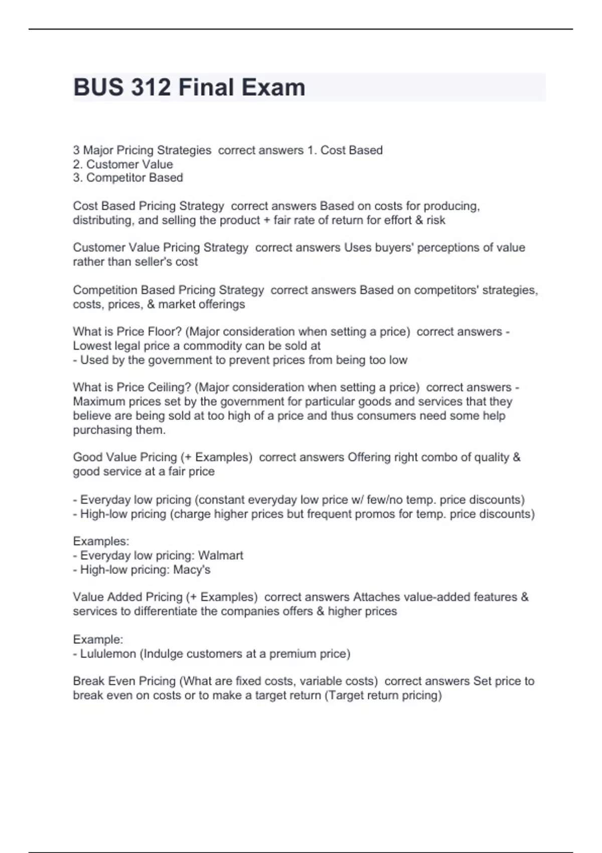3 Major Pricing Strategies correct answers 1. Cost Based 2. Customer Value 3. Competitor Based Cost Based Pricing Strategy correct answers Based on costs for producing, distributing, and selling the product + fair rate of return for effort & risk Customer Value Pricing Strategy correct answers Uses buyers' perceptions of value rather than seller's cost Competition Based Pricing Strategy correct answers Based on competitors' strategies, costs, prices, & market offerings What is Price Floor? (Major consideration when setting a price) correct answers - Lowest legal price a commodity can be sold at - Used by the government to prevent prices from being too low What is Price Ceiling? (Major consideration when setting a price) correct answers - Maximum prices set by the government for particular goods and services that they believe are being sold at too high of a price and thus consumers need some help purchasing them. Good Value Pricing (+ Examples) correct answers Offering right combo of quality & good service at a fair price - Everyday low pricing (constant everyday low price w/ few/no temp. price discounts) - High-low pricing (charge higher prices but frequent promos for temp. price discounts) Examples: - Everyday low pricing: Walmart - High-low pricing: Macy's Value Added Pricing (+ Examples) correct answers Attaches value-added features & services to differentiate the companies offers & higher prices Example: - Lululemon (Indulge customers at a premium price) Break Even Pricing (What are fixed costs, variable costs) correct answers Set price to break even on costs or to make a target return (Target return pricing)
