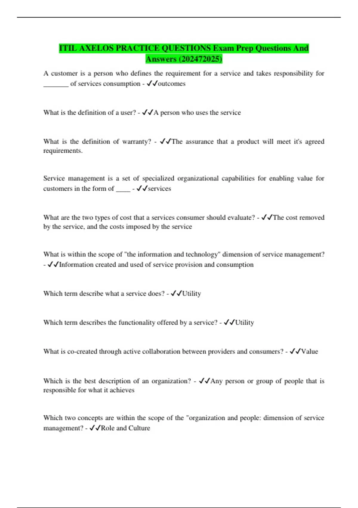 ITIL AXELOS PRACTICE QUESTIONS Exam Prep Questions And Answers ()