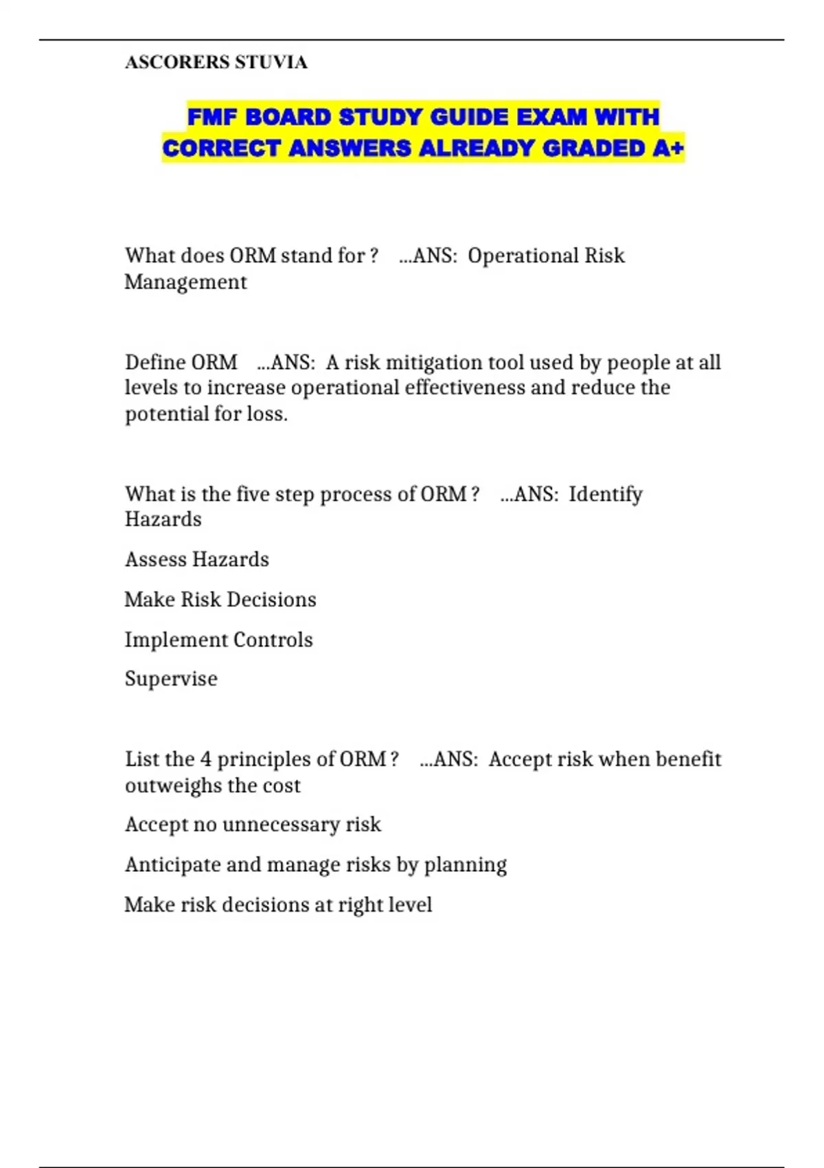 FMF BOARD STUDY GUIDE EXAM WITH CORRECT ANSWERS ALREADY GRADED A+