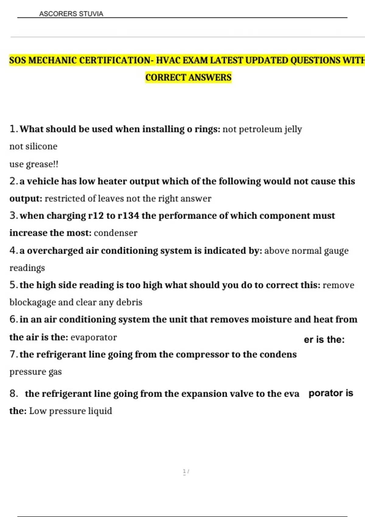 SOS MECHANIC CERTIFICATION- HVAC EXAM LATEST UPDATED QUESTIONS WITH CORRECT ANSWERS