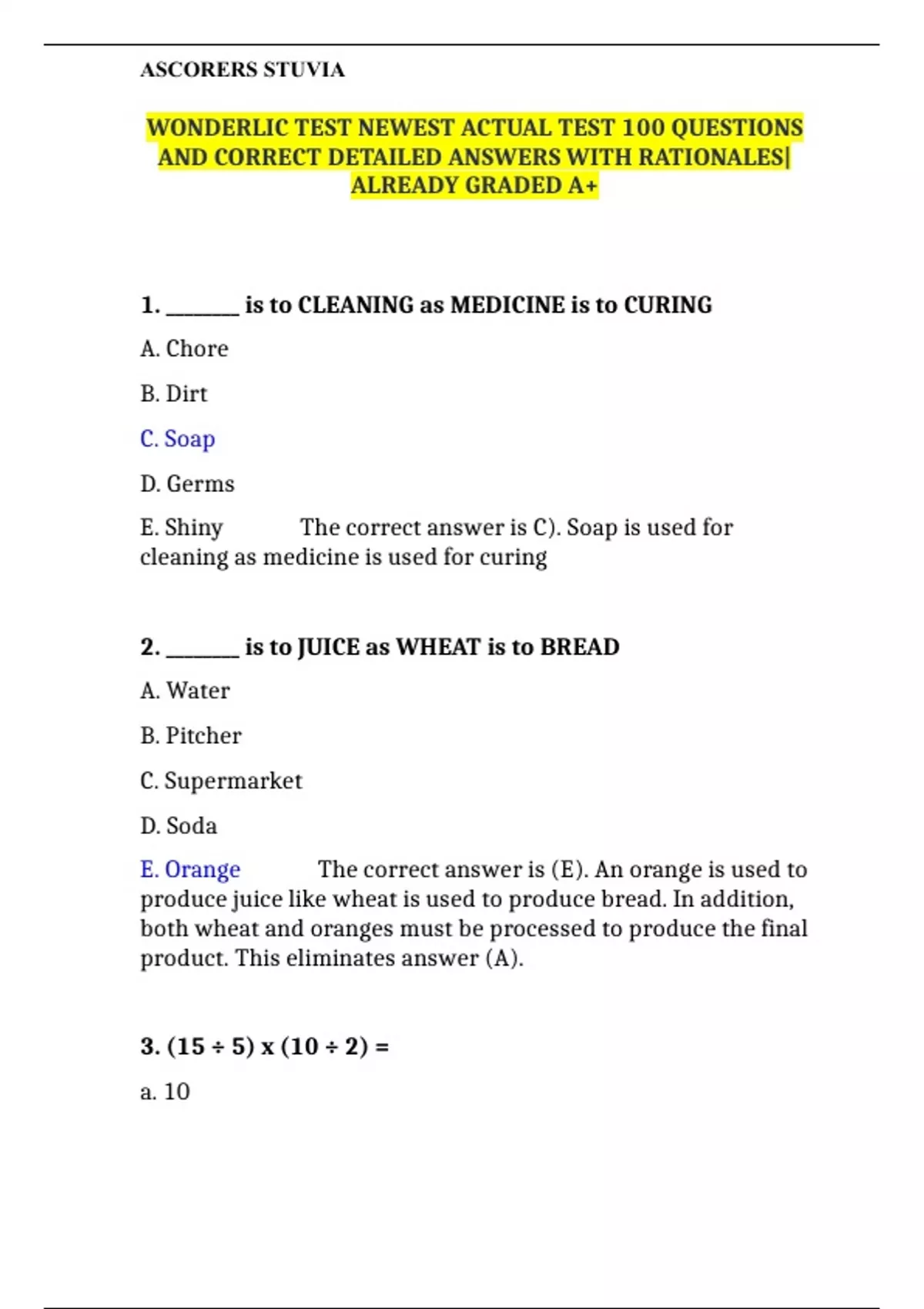 WONDERLIC TEST NEWEST ACTUAL TEST 100 QUESTIONS AND CORRECT DETAILED ANSWERS WITH RATIONALES|ALREADY GRADED A+