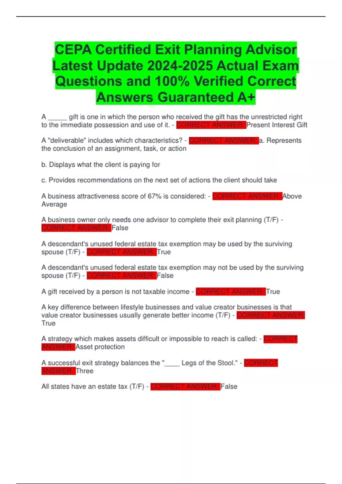 CEPA Certified Exit Planning Advisor Latest Update Actual Exam Questions and 100% Verified Correct Answers Guaranteed A+