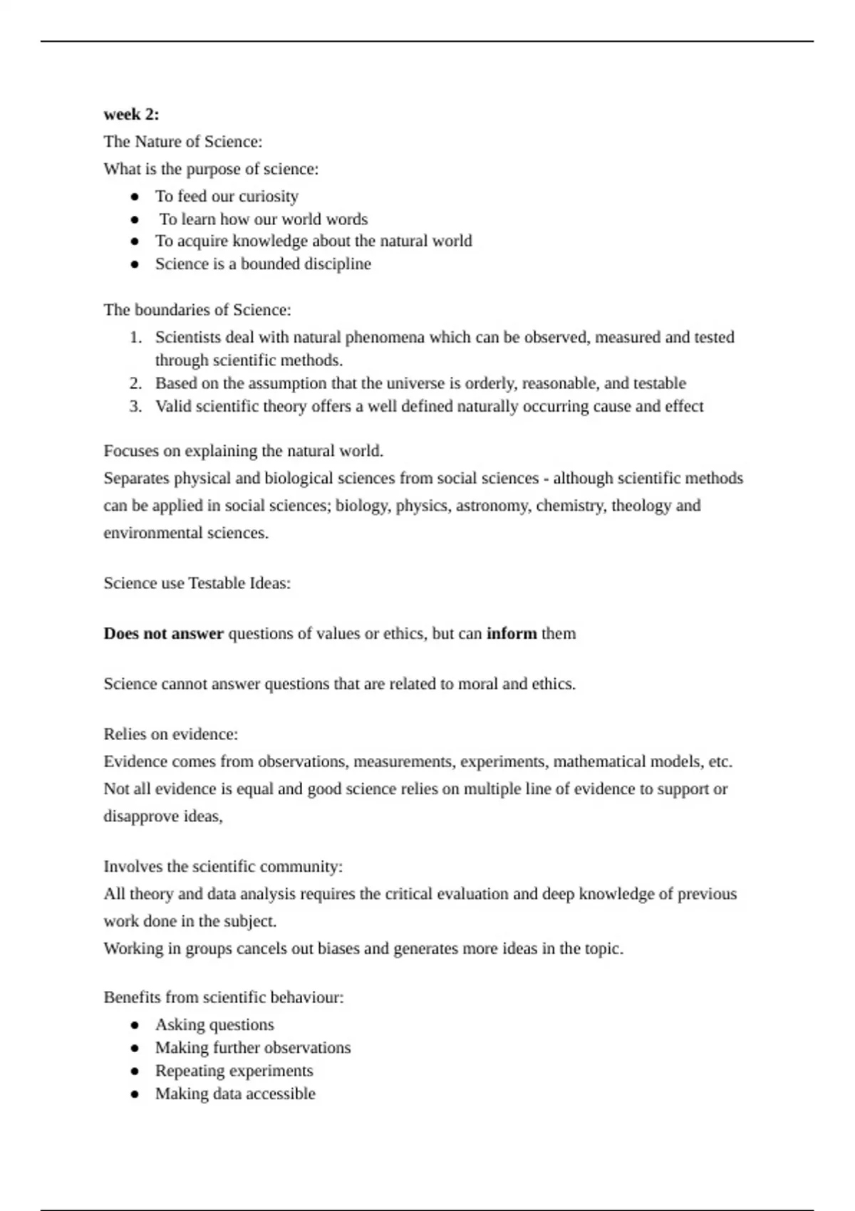 ns of values or ethics, but caninformthemScience cannot answer questions that are related to moral and ethics.Relies on evidence:Evidence comes from observations, measurements, experiments, mathematical models, etc.Not all evidence is equal and good science relies on multiple line of evidence to support ordisapprove ideas,Involves the scientific community:All theory and data analysis requires the critical evaluation and deep knowledge of previouswork done in the subject.Working in groups cancels out biases and generates more ideas in the topic.Benefits from scientific behaviour:●Asking questions●Making further observations●Repeating experiments●Making data accessible