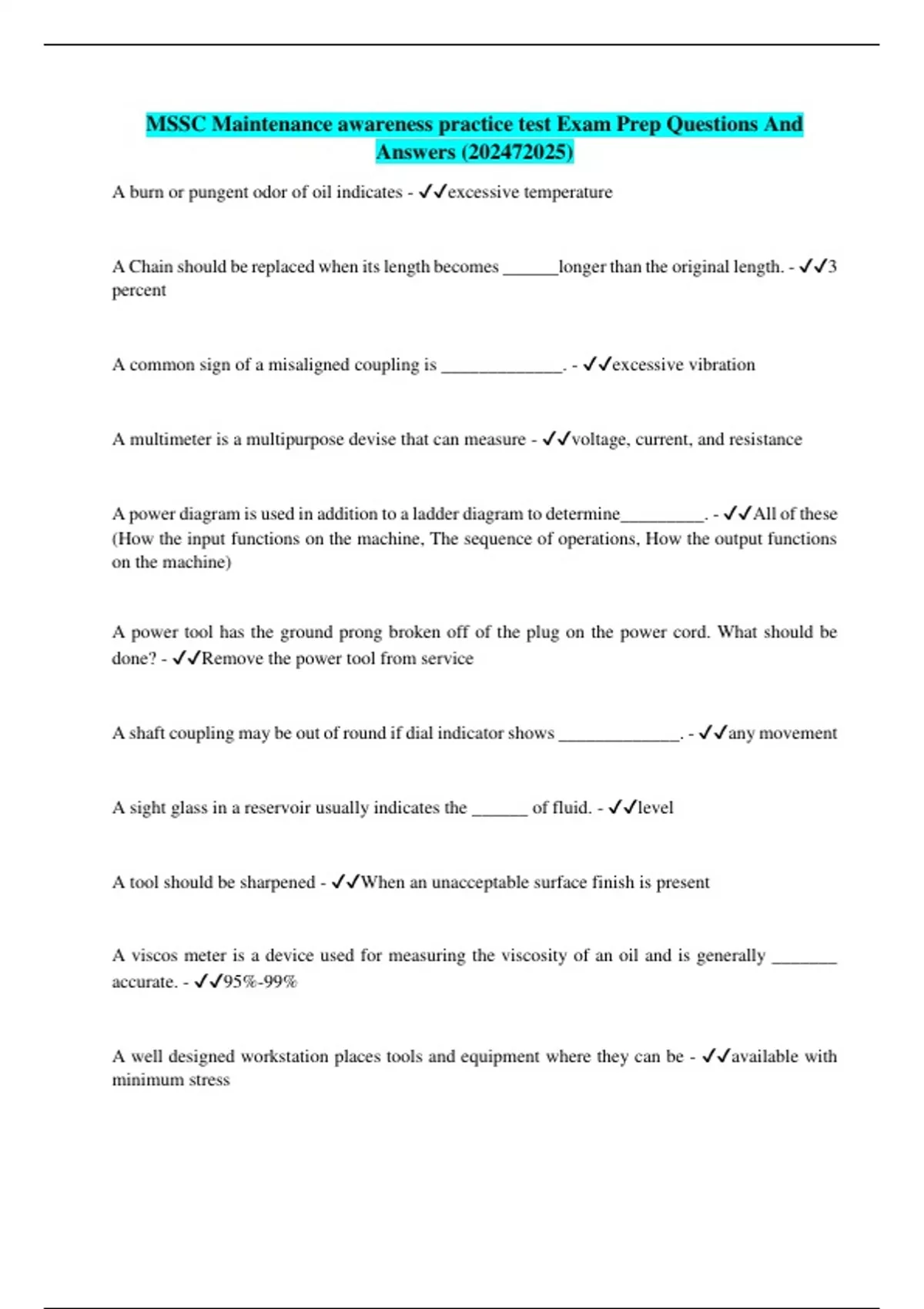 MSSC Maintenance awareness practice test Exam Prep Questions And Answers ()