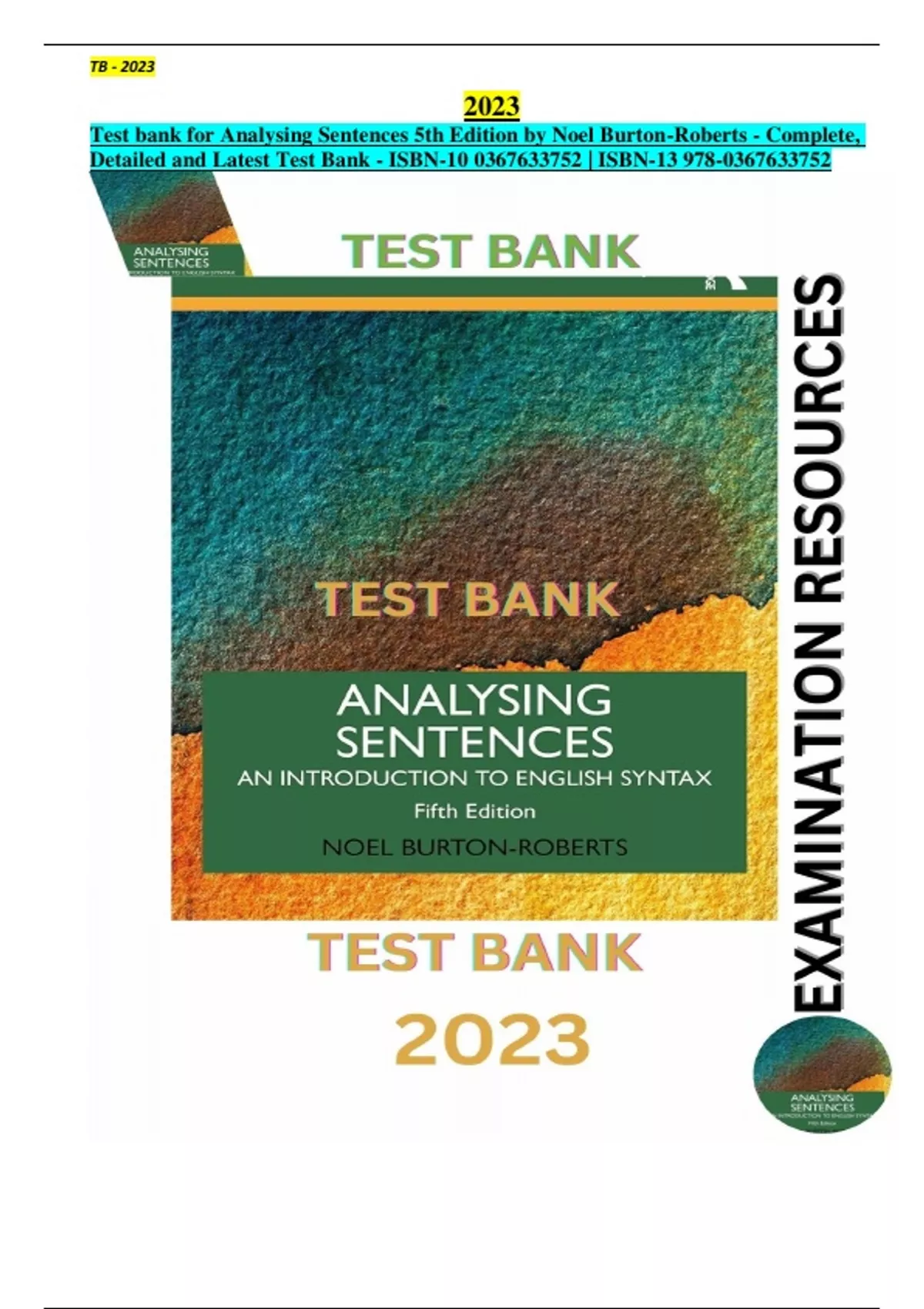 Exam Resources - TB for Analysing Sentences 5th Edition by Noel Burton-Roberts - Complete, Detailed and Latest Test Bank. All Chapters (1-11) Included.