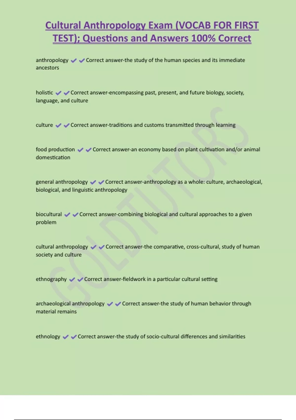 Cultural Anthropology Exam (VOCAB FOR FIRST TEST); Questions and Answers 100% Correct anthropology Correct answer-the study of the human species and its immediate ancestors holistic Correct answer-encompassing past, present, and future biology, society, language, and culture culture Correct answer-traditions and customs transmitted through learning food production Correct answer-an economy based on plant cultivation and/or animal domestication general anthropology Correct answer-anthropology as a whole: culture, archaeological, biological, and linguistic anthropology
