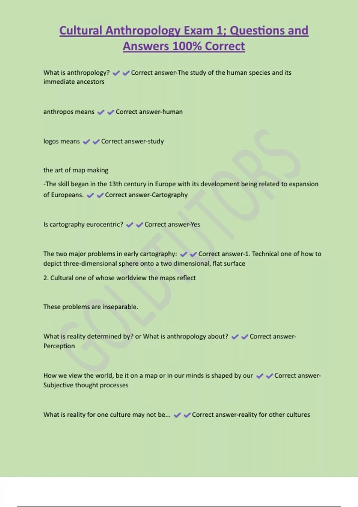 Cultural Anthropology Exam 1; Questions and Answers 100% Correct What is anthropology? Correct answer-The study of the human species and its immediate ancestors anthropos means Correct answer-human logos means Correct answer-study the art of map making -The skill began in the 13th century in Europe with its development being related to expansion of Europeans. Correct answer-Cartograph