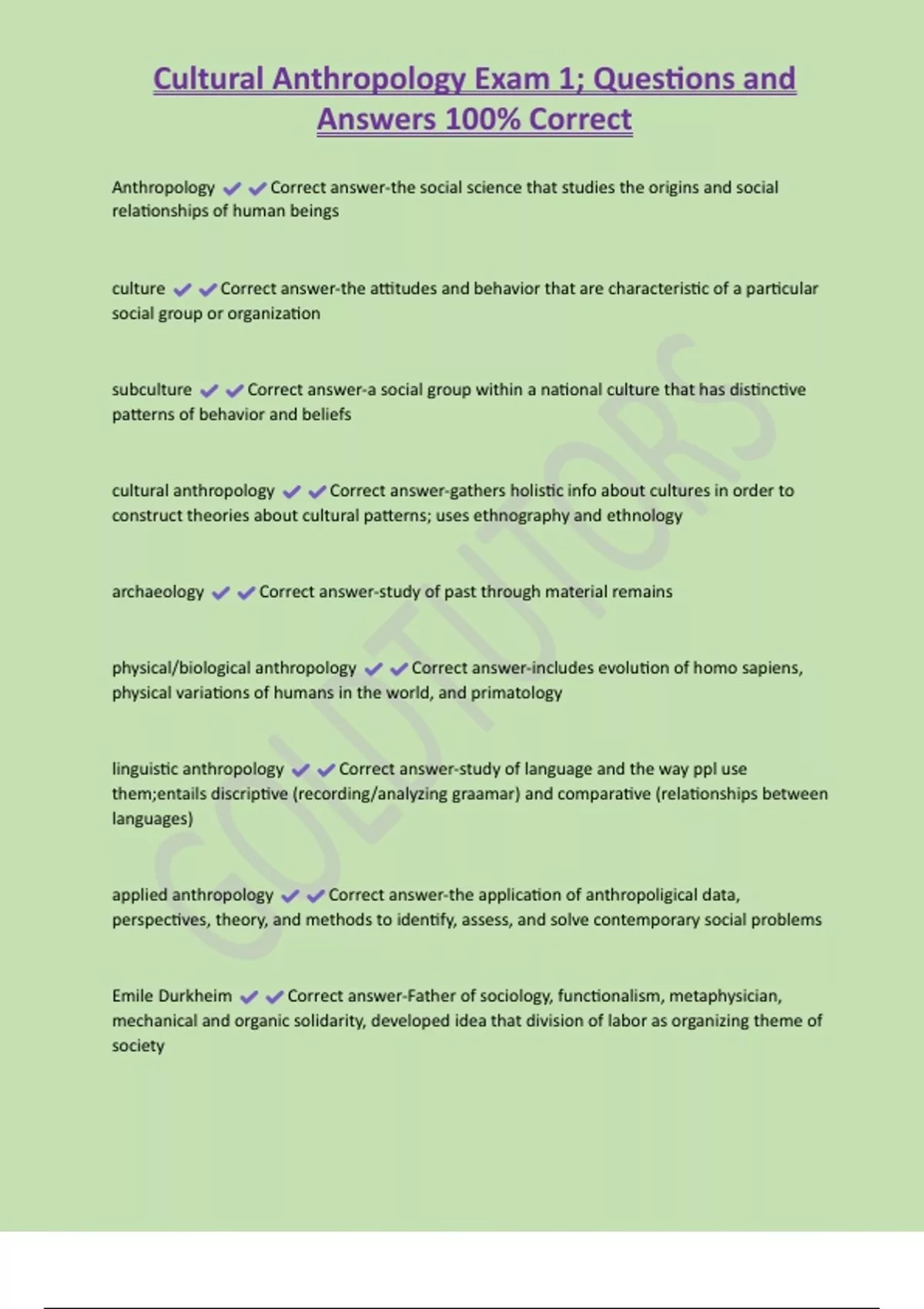 Cultural Anthropology Exam 1; Questions and Answers 100% Correct Anthropology Correct answer-the social science that studies the origins and social relationships of human beings culture Correct answer-the attitudes and behavior that are characteristic of a particular social group or organization subculture Correct answer-a social group within a national culture that has distinctive patterns of behavior and beliefs