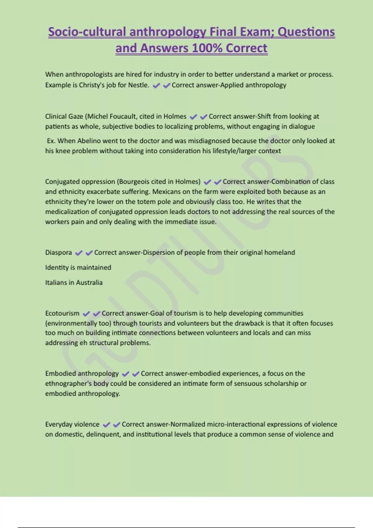 Socio-cultural anthropology Final Exam; Questions and Answers 100% Correct When anthropologists are hired for industry in order to better understand a market or process. Example is Christy's job for Nestle. Correct answer-Applied anthropology Clinical Gaze (Michel Foucault, cited in Holmes Correct answer-Shift from looking at patients as whole, subjective bodies to localizing problems, without engaging in dialogue Ex. When Abelino went to the doctor and was misdiagnosed because the doctor only looked at his knee problem without taking into consideration his lifestyle/larger context
