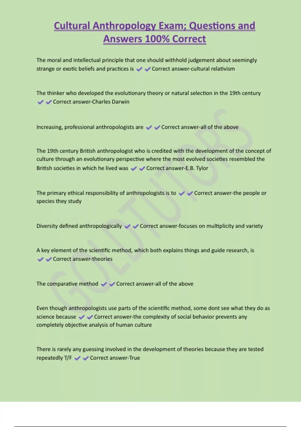 Cultural Anthropology Exam; Questions and Answers 100% Correct The moral and intellectual principle that one should withhold judgement about seemingly strange or exotic beliefs and practices is Correct answer-cultural relativism The thinker who developed the evolutionary theory or natural selection in the 19th century Correct answer-Charles Darwin Increasing, professional anthropologists are Correct answer-all of the above The 19th century British anthropologist who is credited with the development of the concept of culture through an evolutionary perspective where the most evolved societies resembled the British societies in which he lived was Correct answer-E.B. Tylor