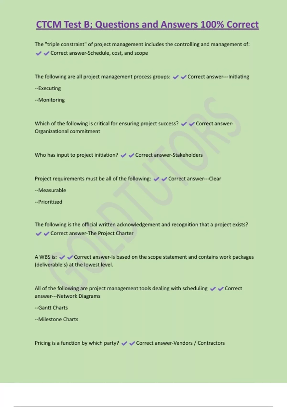 CTCM Test B; Questions and Answers 100% Correct The "triple constraint" of project management includes the controlling and management of: Correct answer-Schedule, cost, and scope The following are all project management process groups: Correct answer---Initiating --Executing --Monitoring Which of the following is critical for ensuring project success? Correct answerOrganizational commitment