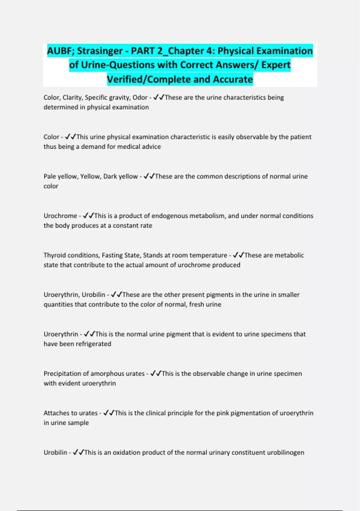 AUBF; Strasinger - PART 2_Chapter 4: Physical Examination of Urine-Questions with Correct Answers/ Expert Verified/Complete and Accurate