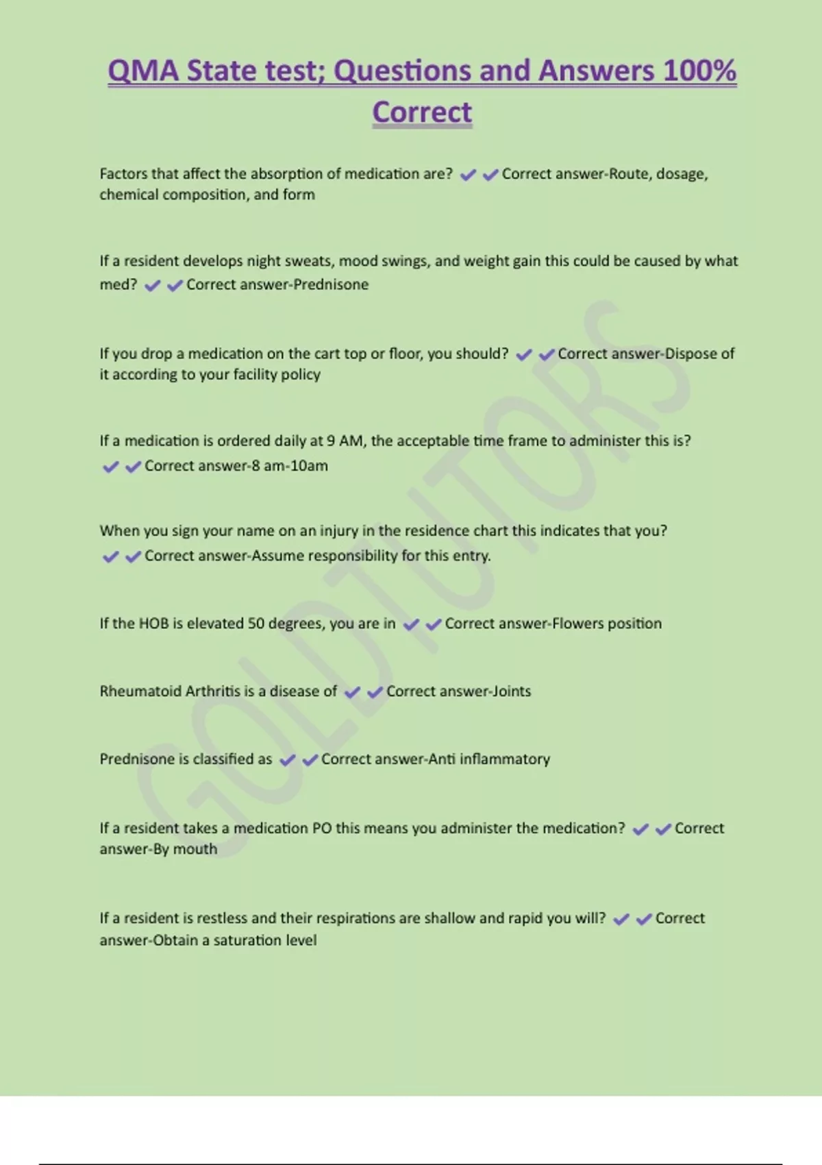QMA State test; Questions and Answers 100% Correct Factors that affect the absorption of medication are? Correct answer-Route, dosage, chemical composition, and form If a resident develops night sweats, mood swings, and weight gain this could be caused by what med? Correct answer-Prednisone If you drop a medication on the cart top or floor, you should? Correct answer-Dispose of it according to your facility policy If a medication is ordered daily at 9 AM, the acceptable time frame to administer this is? Correct answer-8 am-10am