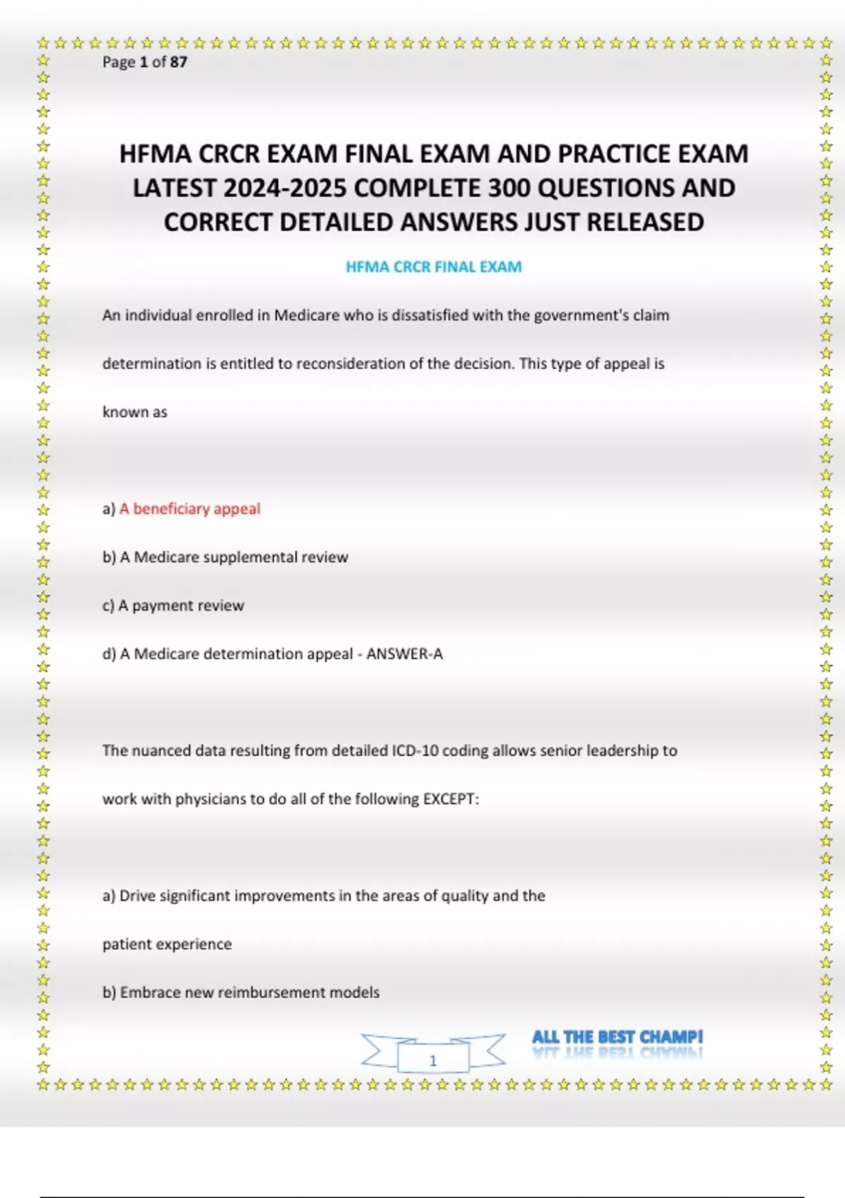 HFMA CRCR EXAM FINAL EXAM AND PRACTICE EXAM LATEST COMPLETE 300 QUESTIONS AND CORRECT DETAILED ANSWERS JUST RELEASED.