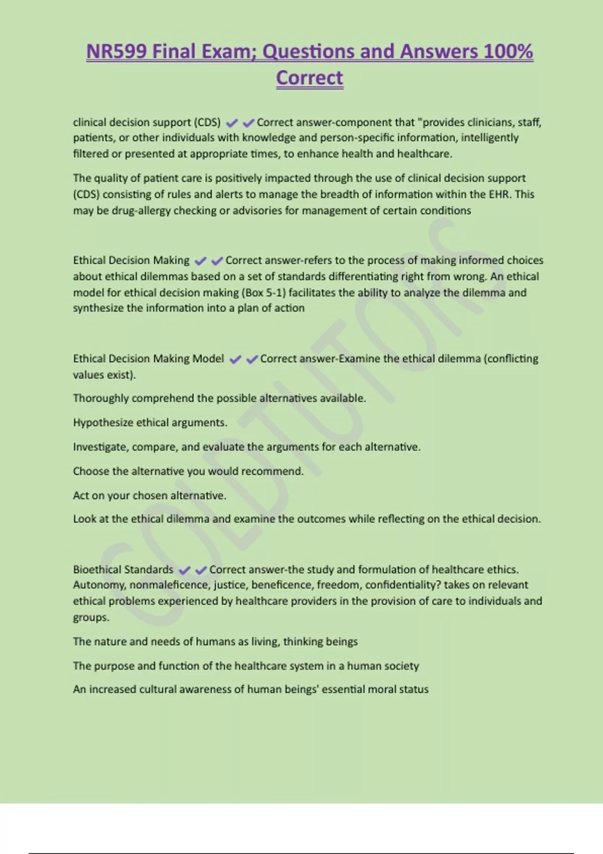 NR599 Final Exam; Questions and Answers 100% Correct clinical decision support (CDS) Correct answer-component that "provides clinicians, staff, patients, or other individuals with knowledge and person-specific information, intelligently filtered or presented at appropriate times, to enhance health and healthcare. The quality of patient care is positively impacted through the use of clinical decision support (CDS) consisting of rules and alerts to manage the breadth of information within the EHR. This may be drug-allergy checking or advisories for management of certain conditions