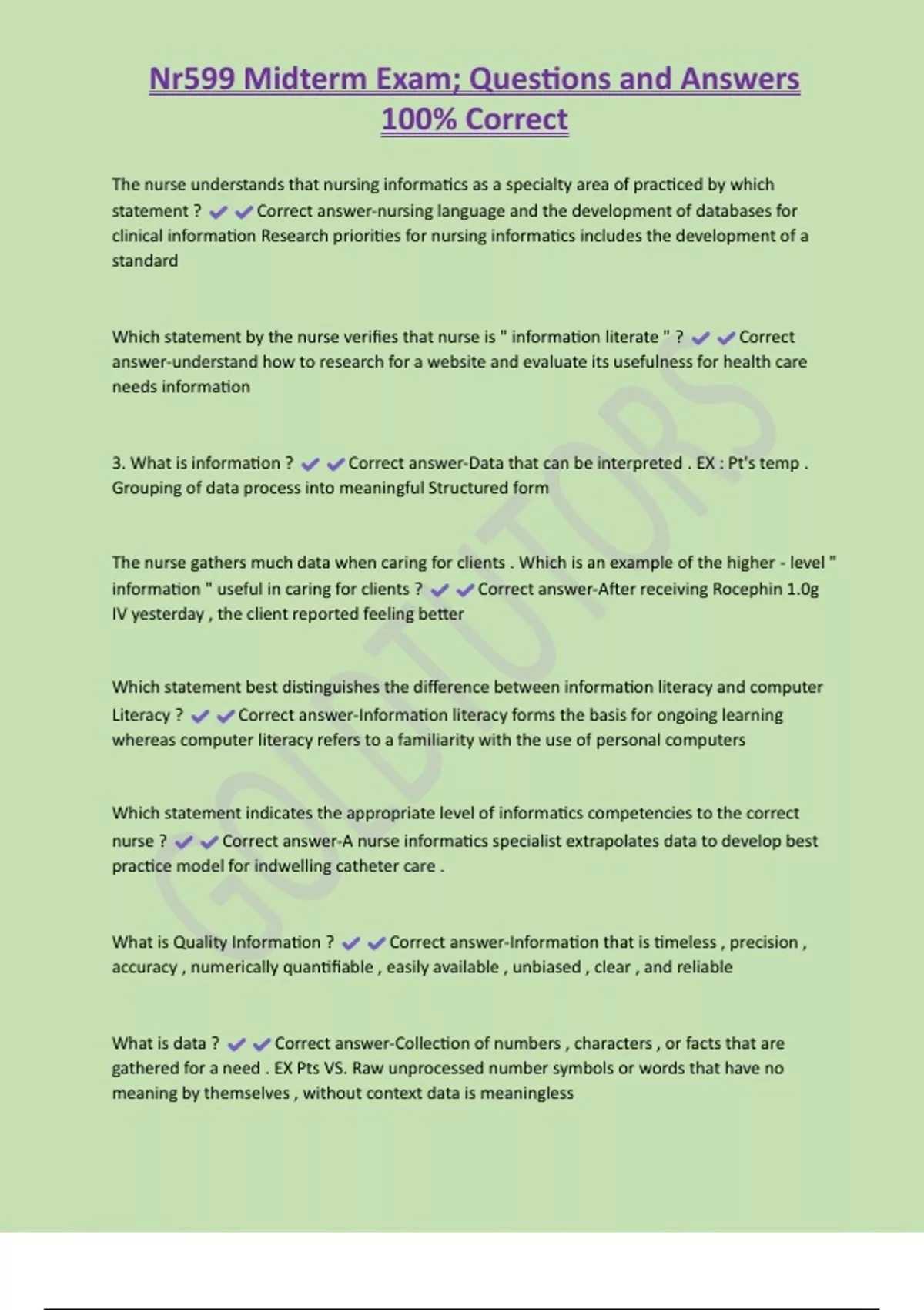 Nr599 Midterm Exam; Questions and Answers 100% Correct The nurse understands that nursing informatics as a specialty area of practiced by which statement ? Correct answer-nursing language and the development of databases for clinical information Research priorities for nursing informatics includes the development of a standard Which statement by the nurse verifies that nurse is " information literate " ? Correct answer-understand how to research for a website and evaluate its usefulness for health care needs information