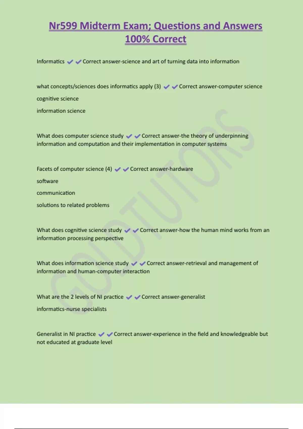 Nr599 Midterm Exam; Questions and Answers 100% Correct Informatics Correct answer-science and art of turning data into information what concepts/sciences does informatics apply (3) Correct answer-computer science cognitive science information science What does computer science study Correct answer-the theory of underpinning information and computation and their implementation in computer systems Facets of computer science (4) Correct answer-hardware software communication solutions to related problem