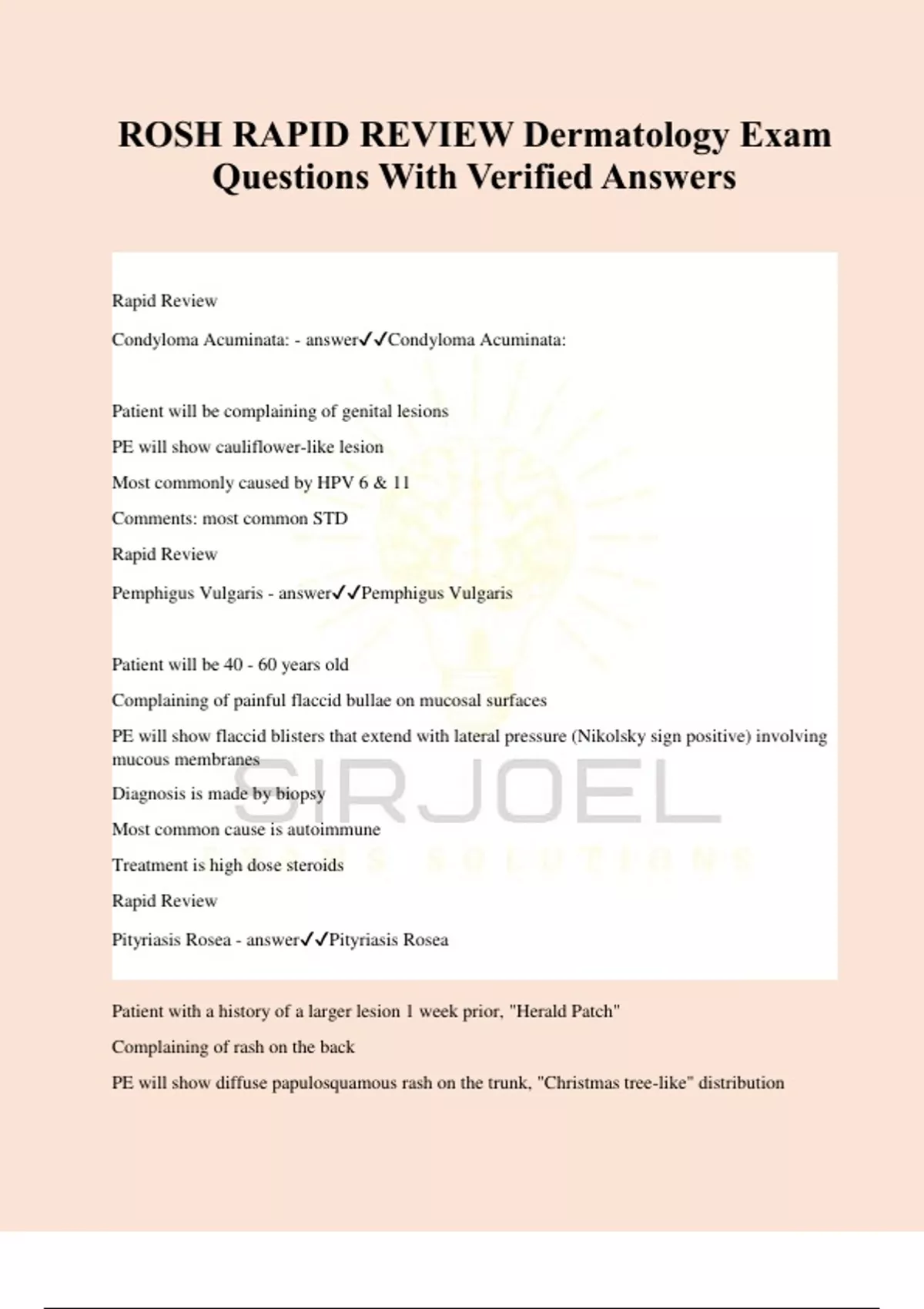 ROSH RAPID REVIEW Dermatology Exam Questions With Verified Answers Rapid Review Condyloma Acuminata: - answerCondyloma Acuminata: Patient will be complaining of genital lesions PE will show cauliflower-like lesion Most commonly caused by HPV 6 & 11 Comments: most common STD Rapid Review Pemphigus Vulgaris - answerPemphigus Vulgaris Patient will be 40 - 60 years old Complaining of painful flaccid bullae on mucosal surfaces PE will show flaccid blisters that extend with lateral pressure (Nikolsky sign positive) involving mucous membranes Diagnosis is made by biopsy Most common cause is autoimmune Treatment is high dose steroids Rapid Review Pityriasis Rosea - answerPityriasis Rosea Patient with a history of a larger lesion 1 week prior, "Herald Patch" Complaining of rash on the back PE will show diffuse papulosquamous rash on the trunk, "Christmas tree-like" distribution Treatment is self-limiting disease, itching with antihistamines Rapid Review Acne Vulgaris - answerAcne Vulgaris Patient will be an adolescent Complaining of rash on face, neck, upper chest and back PE will show closed comedones (whiteheads), open comedones (blackheads), papules and pustules Most commonly caused by Propionibacterium acnes Treatment is: Mild to moderate: topical retinoids, topical antibiotics, or benzoyl peroxide Moderate to severe: add oral antibiotics Severe: oral isotretinoin (Pregnancy class X, must have two forms of birth control) Rapid Review Bullous Pemphigoid - answerBullous Pemphigoid Patient will be older than 60 Complaining of intensely pruritic papules that became large, tense blisters/bullae PE will show tense and firm blisters that do not extend with lateral pressure (Nikolsky sign negative) Most commonly caused by chronic autoimmune blistering disease Treatment is corticosteroids and immunosuppressants Rapid Review Herpes Zoster - answerHerpes Zoster Age, immunodeficiency Reactivation of latent VZV in dorsal root ganglion Grouped vesicles on an erythematous base, dermatomal Postherpetic neuralgia, Ramsay Hunt syndrome, zoster ophthalmicus