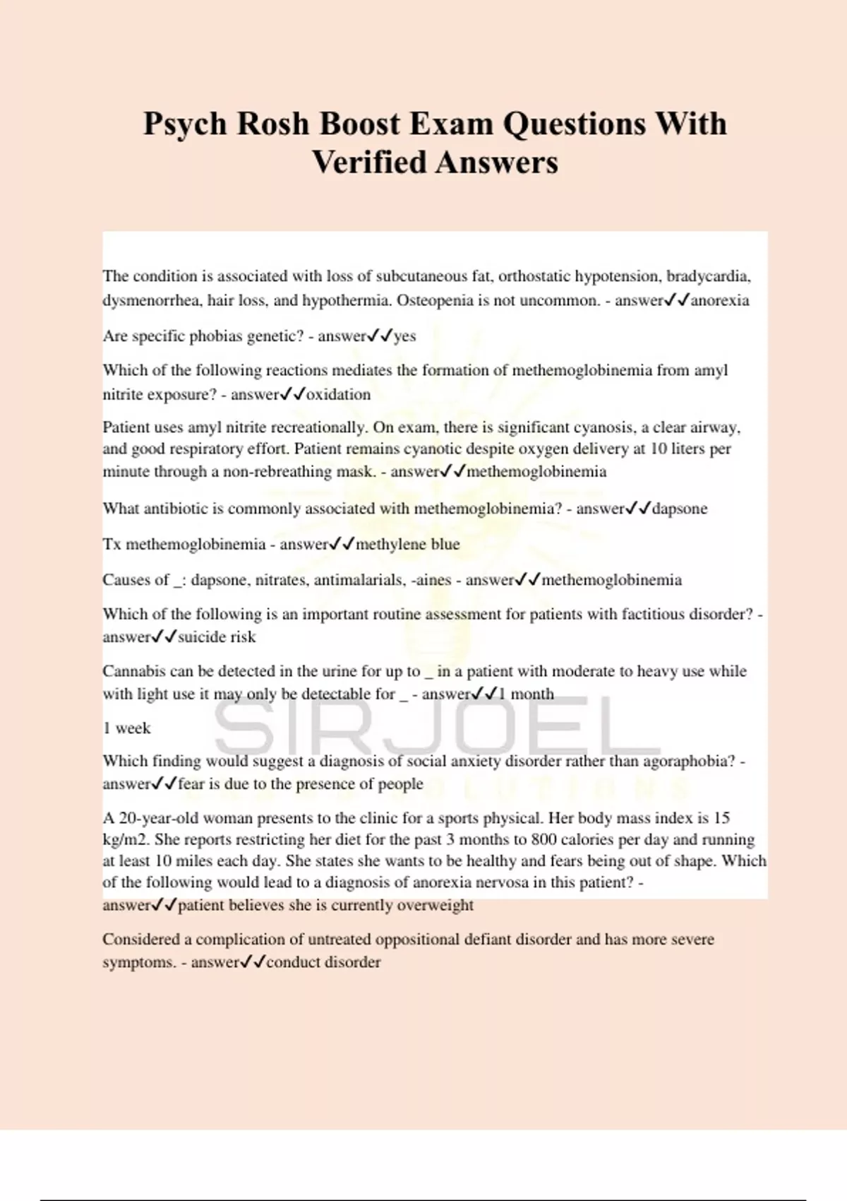 Psych Rosh Boost Exam Questions With Verified Answers The condition is associated with loss of subcutaneous fat, orthostatic hypotension, bradycardia, dysmenorrhea, hair loss, and hypothermia. Osteopenia is not uncommon. - answeranorexia Are specific phobias genetic? - answeryes Which of the following reactions mediates the formation of methemoglobinemia from amyl nitrite exposure? - answeroxidation Patient uses amyl nitrite recreationally. On exam, there is significant cyanosis, a clear airway, and good respiratory effort. Patient remains cyanotic despite oxygen delivery at 10 liters per minute through a non-rebreathing mask. - answermethemoglobinemia What antibiotic is commonly associated with methemoglobinemia? - answerdapsone Tx methemoglobinemia - answermethylene blue Causes of _: dapsone, nitrates, antimalarials, -aines - answermethemoglobinemia Which of the following is an important routine assessment for patients with factitious disorder? - answersuicide risk Cannabis can be detected in the urine for up to _ in a patient with moderate to heavy use while with light use it may only be detectable for _ - answer1 month 1 week Which finding would suggest a diagnosis of social anxiety disorder rather than agoraphobia? - answerfear is due to the presence of people A 20-year-old woman presents to the clinic for a sports physical. Her body mass index is 15 kg/m2. She reports restricting her diet for the past 3 months to 800 calories per day and running at least 10 miles each day. She states she wants to be healthy and fears being out of shape. Which of the following would lead to a diagnosis of anorexia nervosa in this patient? - answerpatient believes she is currently overweight Considered a complication of untreated oppositional defiant disorder and has more severe symptoms. - answerconduct disorder Tx for _: refer the family to parent management therapy that includes the patient and his mother - answerODD Which of the following would be the best choice for initial, non-pharmacologic treatment of his panic disorder? - answerCBT Which one of the following personality disorders is most characterized by a pattern of distrust and suspiciousness that interprets the motives of others as malevolent? - answerparanoid personality disorder What class of medication is most effective in treating a patient with somatic symptom disorder that has not improved with therapy? - answerantidepressants Tx alcohol withdrawal delirium - answerbenzos What supplement has been shown to be effective in treating somatic symptom disorder independent of any existing depression? - answerSt. John's wort 1st line txs for tobacco use disorder - answervarenicline, bupropion, and combo nicotine replacement A 24-year-old man is brought into the ED by a friend who states the man is "acting crazy" and is fighting with an imaginary person. The patient's behavior became erratic after he ingested what appeared to be a pill. He appears disoriented and agitated. He took a swing at the security guard on his way into the building but lost his balance. Physical exam shows both vertical and horizontal nystagmus. What medication is the first-line therapy to treat this patient's intoxication? - answerbenzos PCP Which of the following best represents an indication for use of electroconvulsive therapy as first- line treatment in bipolar I disorder? - answermajor depressive episode with malignant catatonia Which of the following childhood exposures increases the risk of conduct disorder? - answerneglect What is the hallmark and predominant cause of refeeding syndrome? - answerhypophosphatemia Dental caries - answerbulimia What is the best way to diagnose this patient's condition? - answerpatients history A 30-year-old man who was recently arrested is brought to the jail health care clinic for intake evaluation. He says he has been arrested multiple times, with his first arrest occurring at 15 years old after vandalizing his school auditorium. He states he has always had problems with authority figures and has a hard time getting along wit