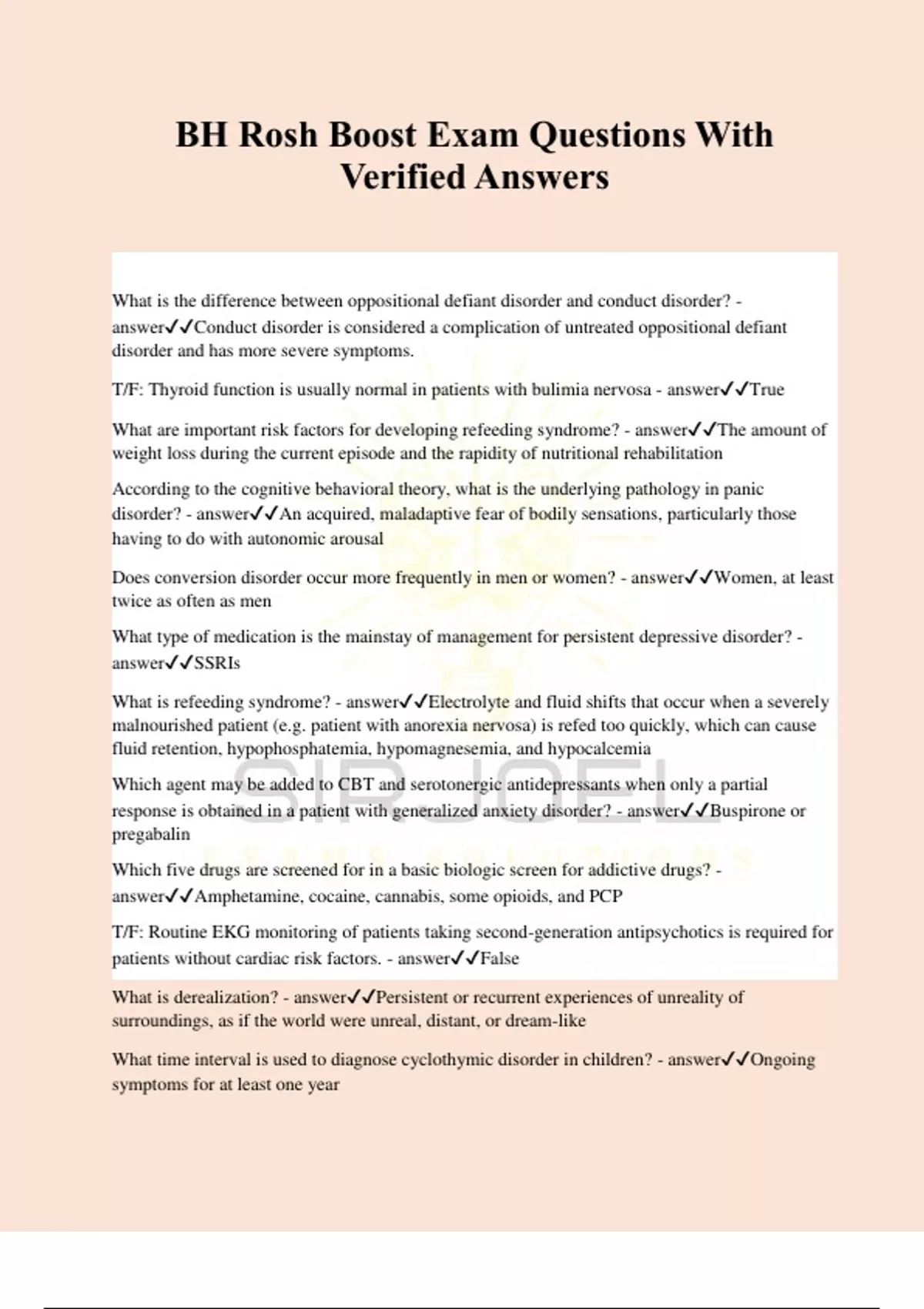 BH Rosh Boost Exam Questions With Verified Answers What is the difference between oppositional defiant disorder and conduct disorder? - answerConduct disorder is considered a complication of untreated oppositional defiant disorder and has more severe symptoms. T/F: Thyroid function is usually normal in patients with bulimia nervosa - answerTrue What are important risk factors for developing refeeding syndrome? - answerThe amount of weight loss during the current episode and the rapidity of nutritional rehabilitation According to the cognitive behavioral theory, what is the underlying pathology in panic disorder? - answerAn acquired, maladaptive fear of bodily sensations, particularly those having to do with autonomic arousal Does conversion disorder occur more frequently in men or women? - answerWomen, at least twice as often as men What type of medication is the mainstay of management for persistent depressive disorder? - answerSSRIs What is refeeding syndrome? - answerElectrolyte and fluid shifts that occur when a severely malnourished patient (e.g. patient with anorexia nervosa) is refed too quickly, which can cause fluid retention, hypophosphatemia, hypomagnesemia, and hypocalcemia Which agent may be added to CBT and serotonergic antidepressants when only a partial response is obtained in a patient with generalized anxiety disorder? - answerBuspirone or pregabalin Which five drugs are screened for in a basic biologic screen for addictive drugs? - answerAmphetamine, cocaine, cannabis, some opioids, and PCP T/F: Routine EKG monitoring of patients taking second-generation antipsychotics is required for patients without cardiac risk factors. - answerFalse What is derealization? - answerPersistent or recurrent experiences of unreality of surroundings, as if the world were unreal, distant, or dream-like What time interval is used to diagnose cyclothymic disorder in children? - answerOngoing symptoms for at least one year According to the Diagnostic Statistical Manual V, which personality disorder cluster does paranoid personality disorder fall under? - answerCluster A What is superior mesenteric artery syndrome? - answerLoss of the fat pad surrounding the superior mesenteric artery in severe anorexia nervosa which leads to compression of the third portion of the duodenum between the superior mesenteric artery and the aorta, causing a small bowel obstruction What is the desired therapeutic lithium level in a patient with acute mania? - answer0.8-1.2 mEq/L Do all patients with panic disorder demonstrate agoraphobia? - answerNo, but the two often present concomitantly. Agoraphobia is diagnosed independently of panic disorder. How can generalized anxiety disorder be distinguished from MDD or dysthymia? - answerPatients with generalized anxiety disorder tend to worry about future events, while those with major depressive or dysthymic disorder tend to brood self-critically over past events What differentiates specific phobia from other anxiety disorders? - answerSymptoms only occur in the presence of the situation or object that produces the phobia What does anosognosia mean? - answerPoor insight How many distinct identities or personality states must be present for a patient to meet criteria for dissociative identity disorder? - answer2 What is the duration of an adequate trial of a pharmacotherapeutic agent in deciding efficacy? - answerSix to 12 weeks What common stimulants are used to treat attention-deficit/hyperactivity disorder? - answerMethylphenidate and amphetamine. Which personality disorders share a common feature of being perceived as odd or eccentric? - answerParanoid, schizoid, and schizotypal personality disorders. What is the difference between conduct disorder and oppositional defiant disorder? - answerConduct disorder involves aggression towards people or animals. How long after a traumatic event will post-traumatic stress disorder manifest? - answerUsually within a few months What are some side effects of topiramate therapy? - answerRenal calculi, hyperthermia, hyperammonemia, metabolic acidosis. What is the difference between cannabis and hashish? - answerCannabis is an unsorted mixture of plant material containing about six percent delta-9-tetrahydrocannabinol, whereas hashish is compressed plant resin containing around 40 percent delta-9-tetrahydrocannabinol.