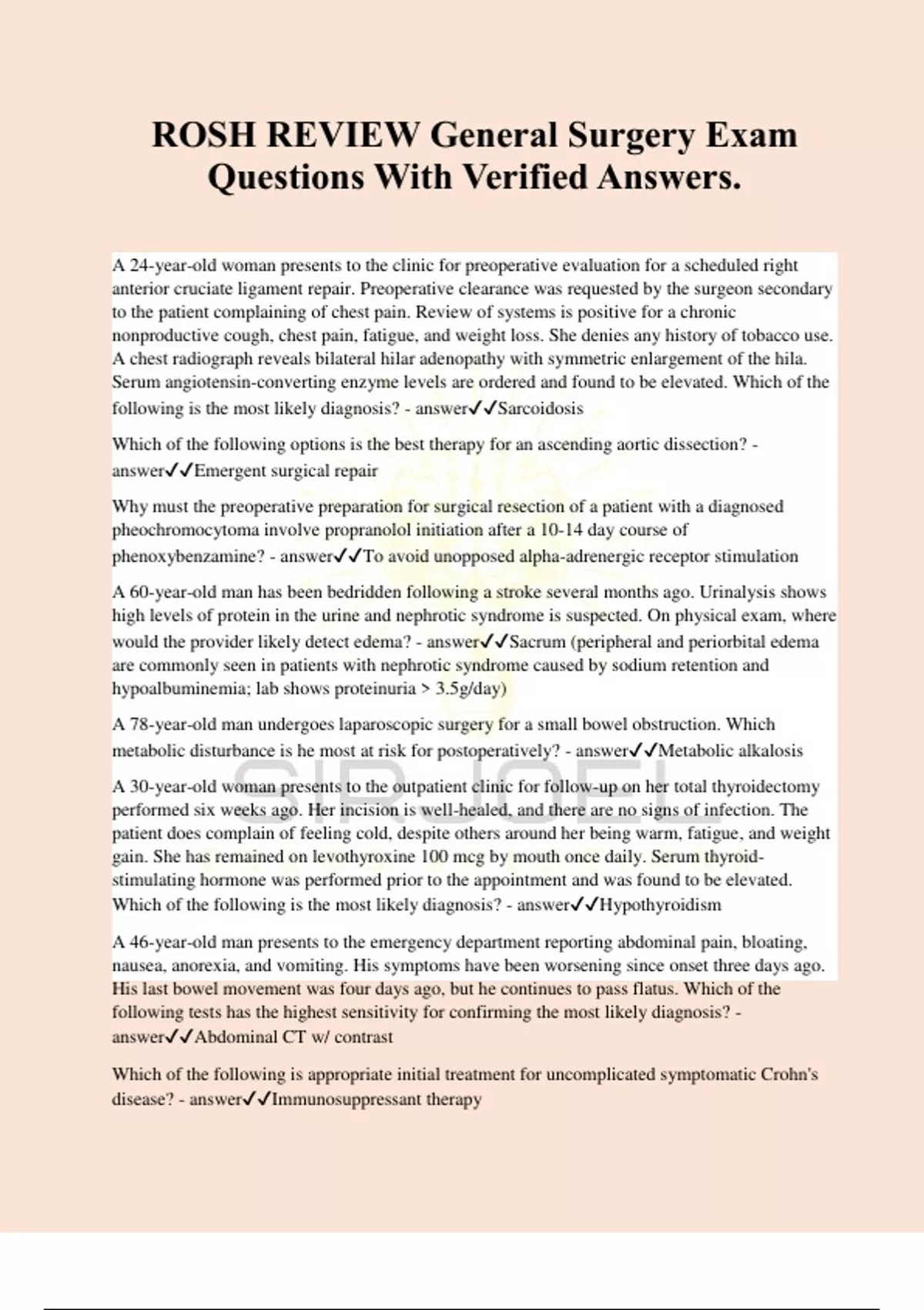 ROSH REVIEW General Surgery Exam Questions With Verified Answers. A 24-year-old woman presents to the clinic for preoperative evaluation for a scheduled right anterior cruciate ligament repair. Preoperative clearance was requested by the surgeon secondary to the patient complaining of chest pain. Review of systems is positive for a chronic nonproductive cough, chest pain, fatigue, and weight loss. She denies any history of tobacco use. A chest radiograph reveals bilateral hilar adenopathy with symmetric enlargement of the hila. Serum angiotensin-converting enzyme levels are ordered and found to be elevated. Which of the following is the most likely diagnosis? - answerSarcoidosis Which of the following options is the best therapy for an ascending aortic dissection? - answerEmergent surgical repair Why must the preoperative preparation for surgical resection of a patient with a diagnosed pheochromocytoma involve propranolol initiation after a 10-14 day course of phenoxybenzamine? - answerTo avoid unopposed alpha-adrenergic receptor stimulation A 60-year-old man has been bedridden following a stroke several months ago. Urinalysis shows high levels of protein in the urine and nephrotic syndrome is suspected. On physical exam, where would the provider likely detect edema? - answerSacrum (peripheral and periorbital edema are commonly seen in patients with nephrotic syndrome caused by sodium retention and hypoalbuminemia; lab shows proteinuria > 3.5g/day) A 78-year-old man undergoes laparoscopic surgery for a small bowel obstruction. Which metabolic disturbance is he most at risk for postoperatively? - answerMetabolic alkalosis A 30-year-old woman presents to the outpatient clinic for follow-up on her total thyroidectomy performed six weeks ago. Her incision is well-healed, and there are no signs of infection. The patient does complain of feeling cold, despite others around her being warm, fatigue, and weight gain. She has remained on levothyroxine 100 mcg by mouth once daily. Serum thyroid- stimulating hormone was performed prior to the appointment and was found to be elevated. Which of the following is the most likely diagnosis? - answerHypothyroidism A 46-year-old man presents to the emergency department reporting abdominal pain, bloating, nausea, anorexia, and vomiting. His symptoms have been worsening since onset three days ago. His last bowel movement was four days ago, but he continues to pass flatus. Which of the following tests has the highest sensitivity for confirming the most likely diagnosis? - answerAbdominal CT w/ contrast Which of the following is appropriate initial treatment for uncomplicated symptomatic Crohn's disease? - answerImmunosuppressant therapy Parents bring their previously healthy four-week-old boy to the ED due to repeated "projectile vomiting" immediately after he nurses for the past 24 hours. The parents report the emesis looks just like breast milk. He has had a normal pattern of wet diapers. The parents deny any rectal bleeding. He has not had any difficulty nursing before, and attempts at burping him have not brought any relief. Vital signs include a temperature of 98.8°F. Physical exam reveals an alert, crying infant with a small, firm right upper quadrant mass. Blood analysis is within normal limits. Which of the following choices is the best next step for this patient? - answerOrder transabdominal ultrasound A 66-year-old man with hypertension and type II diabetes mellitus presents to the ED complaining of chest tightness, dyspnea, and dizziness while mowing his lawn earlier that day. He had similar symptoms two weeks ago. His symptoms resolved within a couple of minutes of sitting to rest. He is currently pain-free. Vital signs are pulse 88 beats per minute, blood pressure 134/88 mm Hg, temperature 98.8°F, oxygen saturation 97%, and 20 respirations per minute. Exam reveals an obese man in no acute distress and is otherwise unremarkable. Electrocardiogram is obtained and shown above. Which of the following is the most likely diagnosis? - answerAngina pectoris You are evaluating a 48-year-old woman with right lower extremity swelling, pain, and redness. She is eight days status-post open cholecystectomy. She was on lovenox for two days postoperatively but is not currently taking any medications except oxycodone for pain. What is the test of choice to confirm your suspected diagnosis? - answerVenous doppler ultrasound Which of the following is a physical exam finding characterized by pain and inspiratory arrest during palpation of the right upper quadrant? - answerMurphy's sign A 66-year-old woman with a past medical history of uncontrolled diabetes mellitus, obesity, and rheumatoid arthritis who is on methotrexate presents to the emergency department complaining of redness, drainage, and pain at her incision site. She had an umbilical hernia repair approximately six days prior. On exam, you note the patient has a fever of 100.6°F and the incision site is erythematous and warm with a small amount of purulent drainage noted. There are no signs of wound dehiscence and no areas of fluctuance noted. Which of the following is the most likely diagnosis? - answerCellulitis Which of the following blood analysis tests is indicated to diagnose anemia? - answerComplete blood count Which of the following physical exam findings is more indicative of skin abscess than cellulitis? - answerFluctuance A 31-year-old man presents to the emergency department after an episode of syncope following sexual intercourse. Upon regaining consciousness at home, patient began complaining of a severe headache and started to vomit. Physical examination reveals an uncomfortable man with positive meningeal signs. Blood pressure is 162/94 mm Hg. CT scan of the head without contrast reveals no acute pathology. Based on the most likely diagnosis, what would you expect on the patient's lumbar puncture? - answerHemoglobin degradation products (xanthochromia from subarachnoid hemorrhage; tx inc