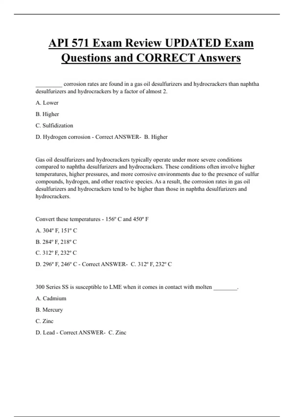 API 571 Exam Review UPDATED Exam Questions and CORRECT Answers _________ corrosion rates are found in a gas oil desulfurizers and hydrocrackers than naphtha desulfurizers and hydrocrackers by a factor of almost 2. A. Lower B. Higher C. Sulfidization D. Hydrogen corrosion - Correct ANSWER- B. Higher Gas oil desulfurizers and hydrocrackers typically operate under more severe conditions compared to naphtha desulfurizers and hydrocrackers. These conditions often involve higher temperatures, higher pressures, and more corrosive environments due to the presence of sulfur compounds, hydrogen, and other reactive species. As a result, the corrosion rates in gas oil desulfurizers and hydrocrackers tend to be higher than those in naphtha desulfurizers and hydrocrackers.
