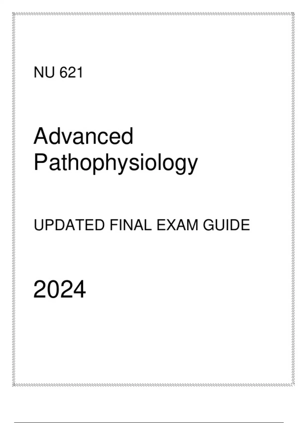 NU 621 Advanced Pathophysiology UPDATED FINAL EXAM GUIDE 2024 1. Multiple Choice: Which of the following pathophysiological changes is most likely to occur in an elderly patient with chronic heart failure? A) Left ventricular hypertrophy B) Decreased cardiac output C) Increased ejection fraction D) Reduced systemic vascular resistance Correct Answer : B) Decreased cardiac output Rationale: Chronic heart fa ilure in elderly patients typically leads to decreased cardiac output due to the heart's reduced ability to pump blood effectively. 2. True/False: In adult gerontology, the presence of kyphosis is a normal physiological change associated with aging. Answer: True Rationale: Kyphosis, or a forward curvature of the spine, is a common change in the skeletal system of older adults. 3. Fill -in-the-Blank: The most common cause of community -acquired pneumonia in the elderly is __________. Correct Answer : Streptococcus pneumoniae Rationale: Streptococcus pneumoniae is the leading cause of bacterial pneumonia in older adults, which can lead to significant morbidity and mortality. Multiple Choice Which of the following is a hallmark manifestation of a cute respiratory distress syndrome (ARDS)? A. Bradycardia B. Hypernatremia C. Hypoxemia D. Hypokalemia Correct Answer : C. Hypoxemia Rationale: Hypoxemia is a classic feature of ARDS due to impaired gas exchange in the lu ngs. Fill-in-the-Blank In sepsis, the body's response to infection triggers a systemic inflammatory response that can lead to _. Correct Answer : Organ dysfunction Rationale: Sepsis -induced inflammation can impair organ function, leading to organ dysfunction and failure. True/False True or False: Chronic obstructive pulmonary disease (COPD) is characterized by reversible airflow obstruction. Correct Answer : False Rationale: COPD involves progressive and irreversible airflow limitation due to chronic inflammation in the airways.