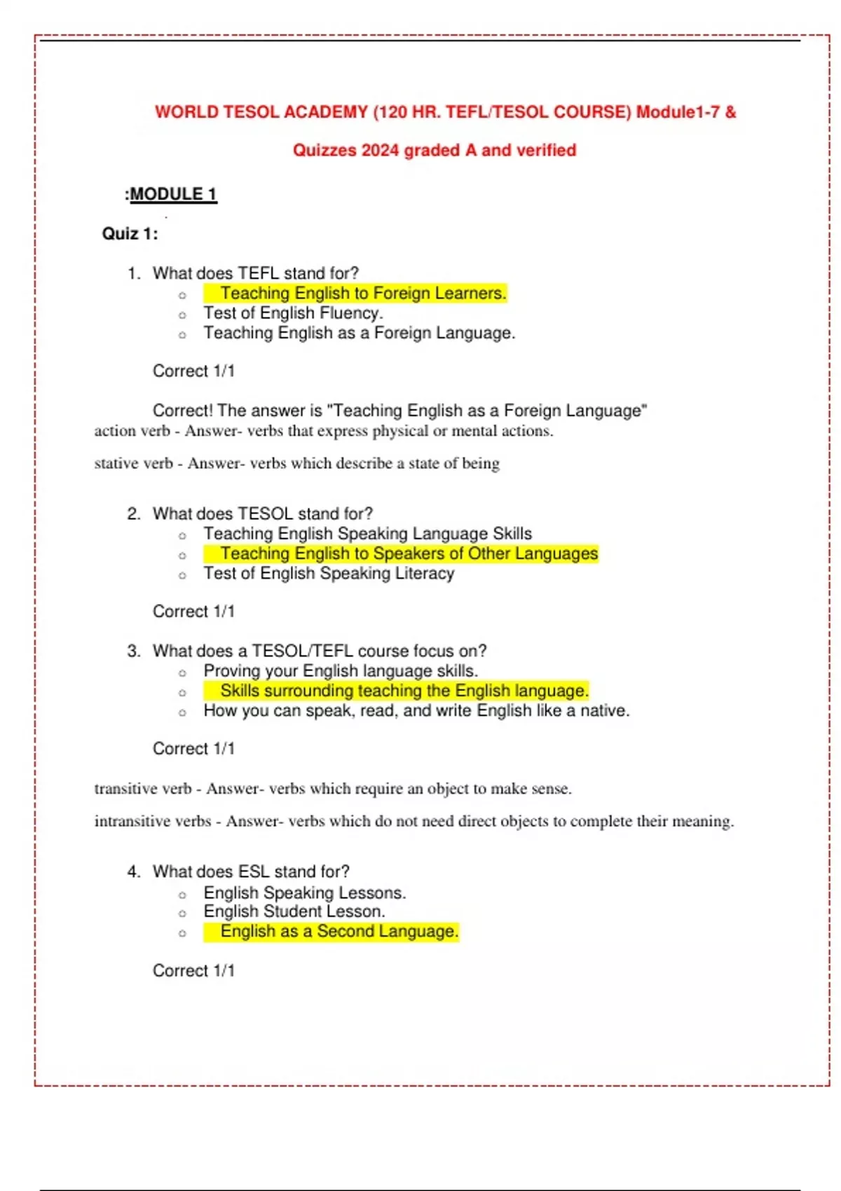 WORLD TESOL ACADEMY (120 HR. TEFL/TESOL COURSE) Module1-7 & Quizzes 2024 graded A and verified : MODULE 1 Quiz 1: 1. What does TEFL stand for? o Teaching English to Foreign Learners. o Test of English Fluency. o Teaching English as a Foreign Language. Correct 1/1 Correct! The answer is "Teaching English as a Foreign Language" action verb - Answer- verbs that express physical or mental actions. stative verb - Answer- verbs which describe a state of being 2. What does TESOL stand for? o Teaching English Speaking Language Skills o Teaching English to Speakers of Other Languages o Test of English Speaking Literacy
