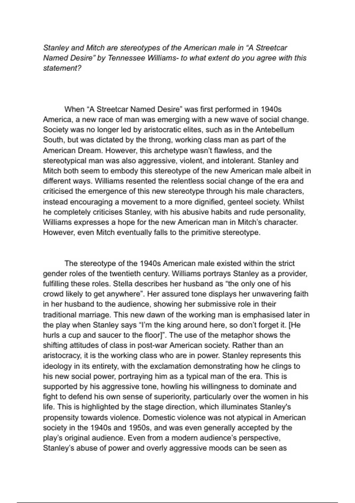 Named Desire” by Tennessee Williams- to what extent do you agree with this