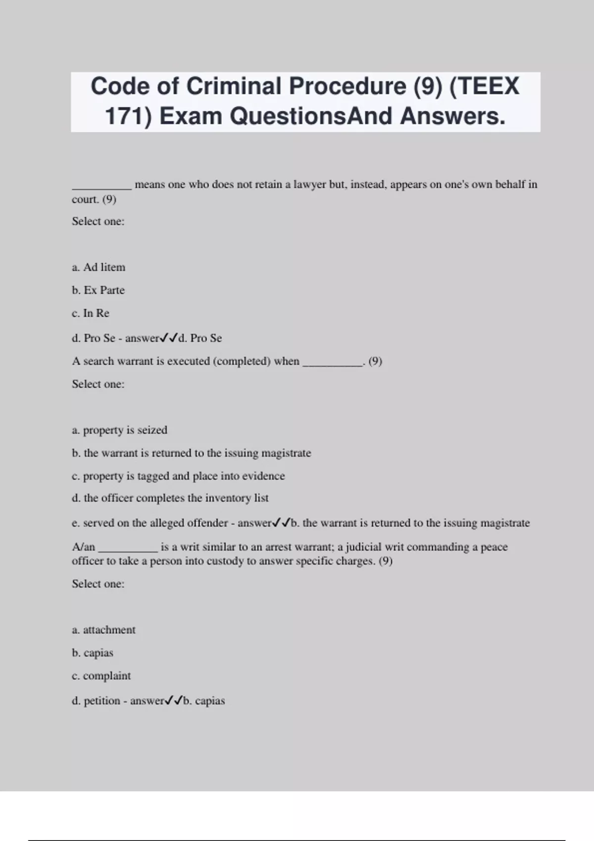 Code of Criminal Procedure (9) (TEEX 171) Exam QuestionsAnd Answers. __________ means one who does not retain a lawyer but, instead, appears on one's own behalf in court. (9) Select one: a. Ad litem b. Ex Parte c. In Re d. Pro Se - answerd. Pro Se A search warrant is executed (completed) when __________. (9) Select one: a. property is seized b. the warrant is returned to the issuing magistrate c. property is tagged and place into evidence d. the officer completes the inventory list e. served on the alleged offender - answerb. the warrant is returned to the issuing magistrate A/an __________ is a writ similar to an arrest warrant; a judicial writ commanding a peace officer to take a person into custody to answer specific charges. (9) Select one: a. attachment b. capias c. complaint d. petition - answerb. capias