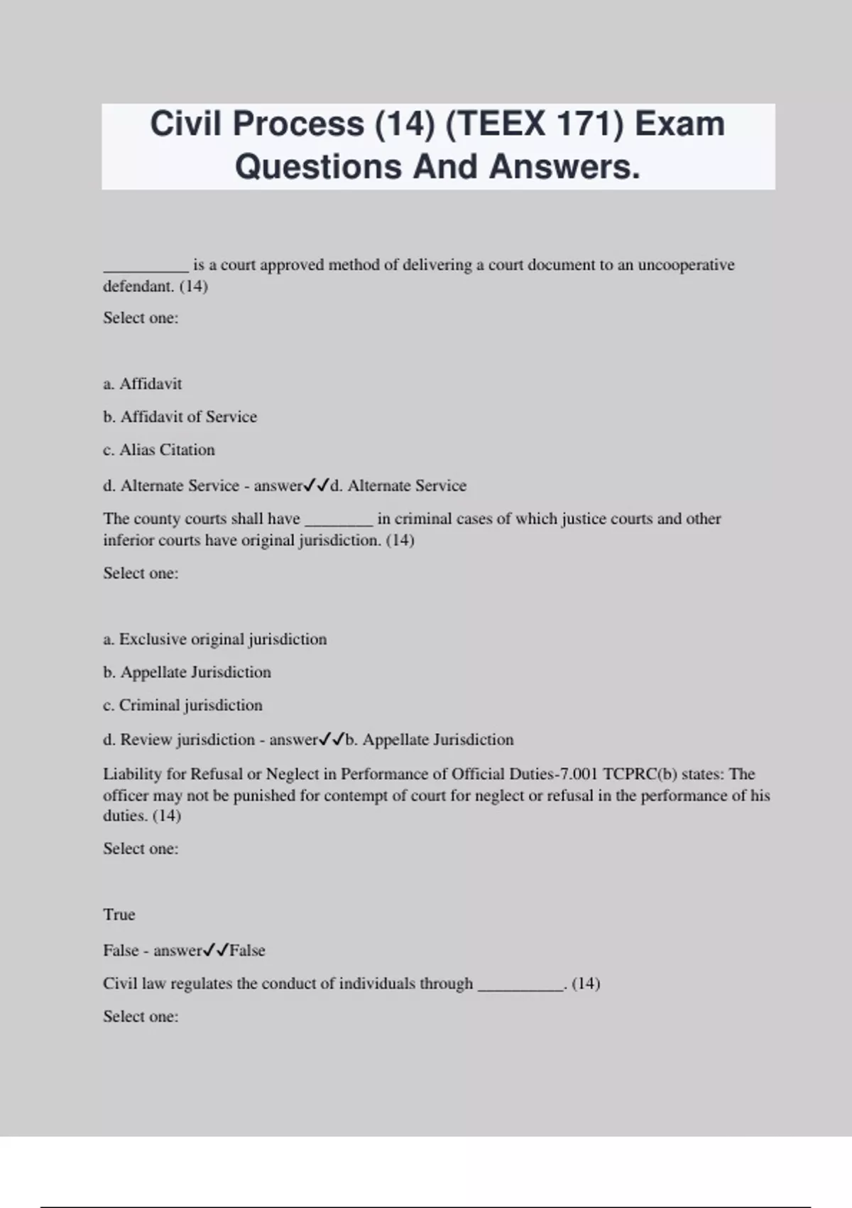 Civil Process (14) (TEEX 171) Exam Questions And Answers. __________ is a court approved method of delivering a court document to an uncooperative defendant. (14) Select one: a. Affidavit b. Affidavit of Service c. Alias Citation d. Alternate Service - answerd. Alternate Service The county courts shall have ________ in criminal cases of which justice courts and other inferior courts have original jurisdiction. (14) Select one: a. Exclusive original jurisdiction b. Appellate Jurisdiction c. Criminal jurisdiction d. Review jurisdiction - answerb. Appellate Jurisdiction Liability for Refusal or Neglect in Performance of Official Duties-7.001 TCPRC(b) states: The officer may not be punished for contempt of court for neglect or refusal in the performance of his duties. (14) Select one: True False - answerFalse Civil law regulates the conduct of individuals through __________. (14) Select one: