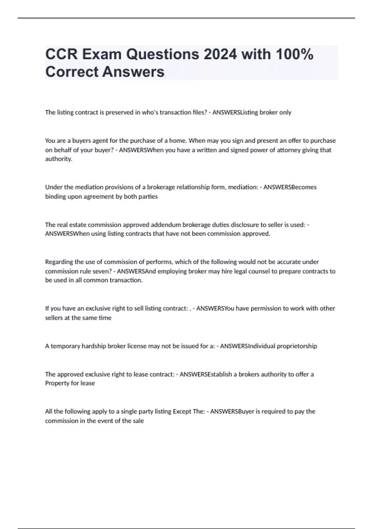 CCR Exam Questions 2024 with 100% Correct Answers The listing contract is preserved in who's transaction files? - ANSWERSListing broker only You are a buyers agent for the purchase of a home. When may you sign and present an offer to purchase on behalf of your buyer? - ANSWERSWhen you have a written and signed power of attorney giving that authority. Under the mediation provisions of a brokerage relationship form, mediation: - ANSWERSBecomes binding upon agreement by both parties The real estate commission approved addendum brokerage duties disclosure to seller is used: - ANSWERSWhen using listing contracts that have not been commission approved. Regarding the use of commission of performs, which of the following would not be accurate under commission rule seven? - ANSWERSAnd employing broker may hire legal counsel to prepare contracts to be used in all common transaction. If you have an exclusive right to sell listing contract: . - ANSWERSYou have permission to work with other sellers at the same time A temporary hardship broker license may not be issued for a: - ANSWERSIndividual proprietorship The approved exclusive right to lease contract: - ANSWERSEstablish a brokers authority to offer a Property for lease All the following apply to a single party listing Except The: - ANSWERSBuyer is required to pay the commission in the event of the sale