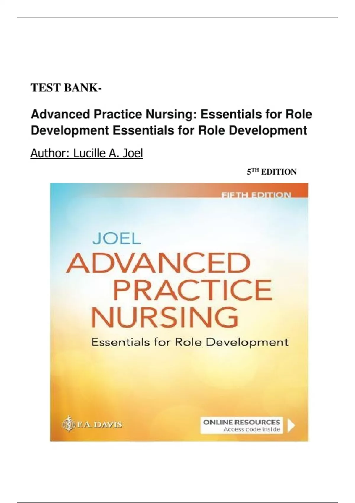 TEST BANK- Advanced Practice Nursing: Essentials for Role Development By Lucille A. Joel (5TH EDITION, 2024) NEWEST UPDATE ||WITH CORRECT ANSWERS