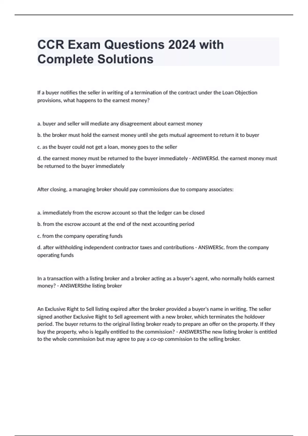 CCR Exam Questions 2024 with Complete Solutions If a buyer notifies the seller in writing of a termination of the contract under the Loan Objection provisions, what happens to the earnest money? a. buyer and seller will mediate any disagreement about earnest money b. the broker must hold the earnest money until she gets mutual agreement to return it to buyer c. as the buyer could not get a loan, money goes to the seller d. the earnest money must be returned to the buyer immediately - ANSWERSd. the earnest money must be returned to the buyer immediately After closing, a managing broker should pay commissions due to company associates: a. immediately from the escrow account so that the ledger can be closed b. from the escrow account at the end of the next accounting period c. from the company operating funds d. after withholding independent contractor taxes and contributions - ANSWERSc. from the company operating funds In a transaction with a listing broker and a broker acting as a buyer's agent, who normally holds earnest money? - ANSWERSthe listing broker An Exclusive Right to Sell listing expired after the broker provided a buyer's name in writing. The seller signed another Exclusive Right to Sell agreement with a new broker, which terminates the holdover period. The buyer returns to the original listing broker ready to prepare an offer on the property. If they buy the property, who is legally entitled to the commission? - ANSWERSThe new listing broker is entitled to the whole commission but may agree to pay a co-op commission to the selling broker.