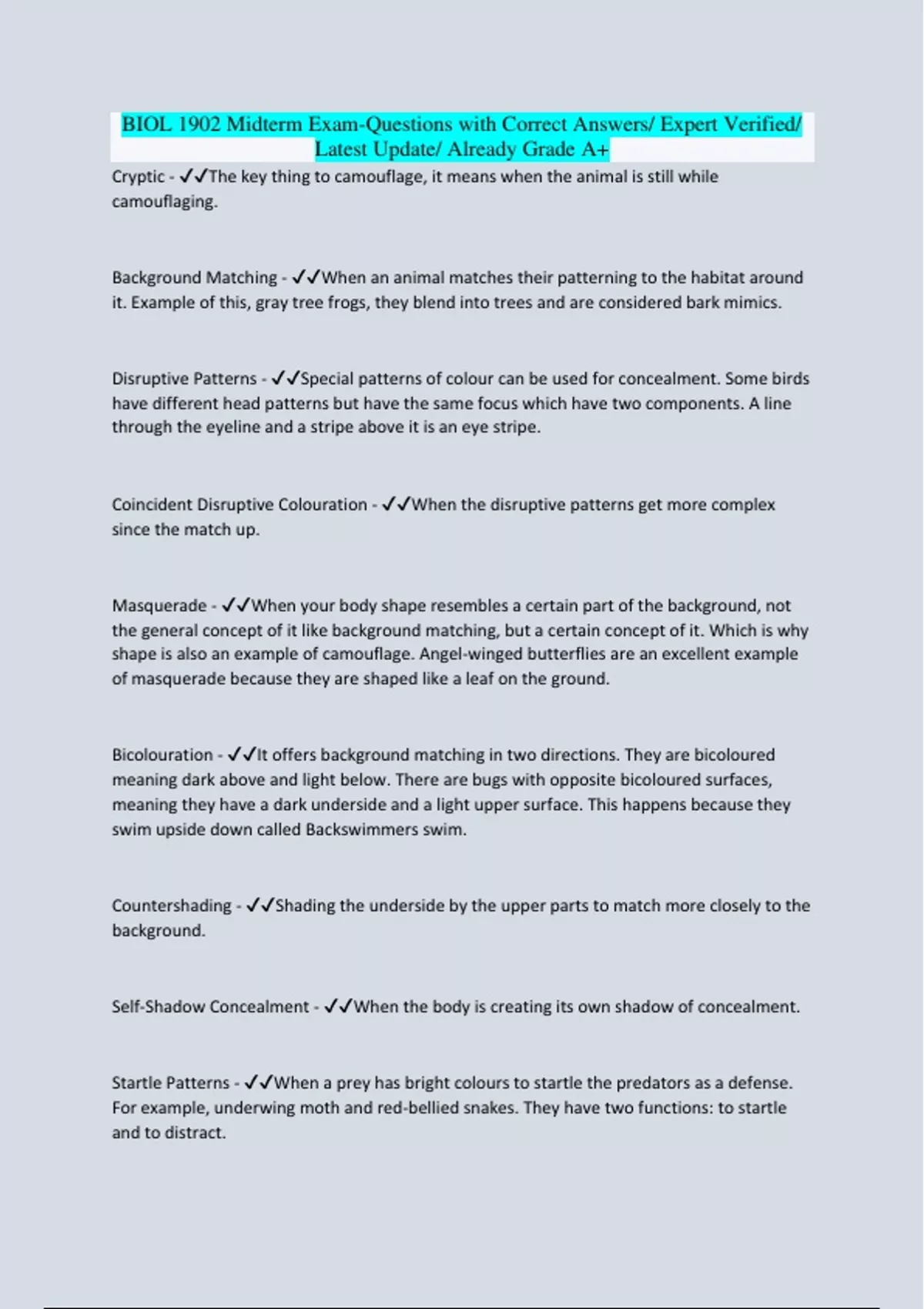 BIOL 1902 Midterm Exam-Questions with Correct Answers/ Expert Verified/ Latest Update/ Already Grade A+