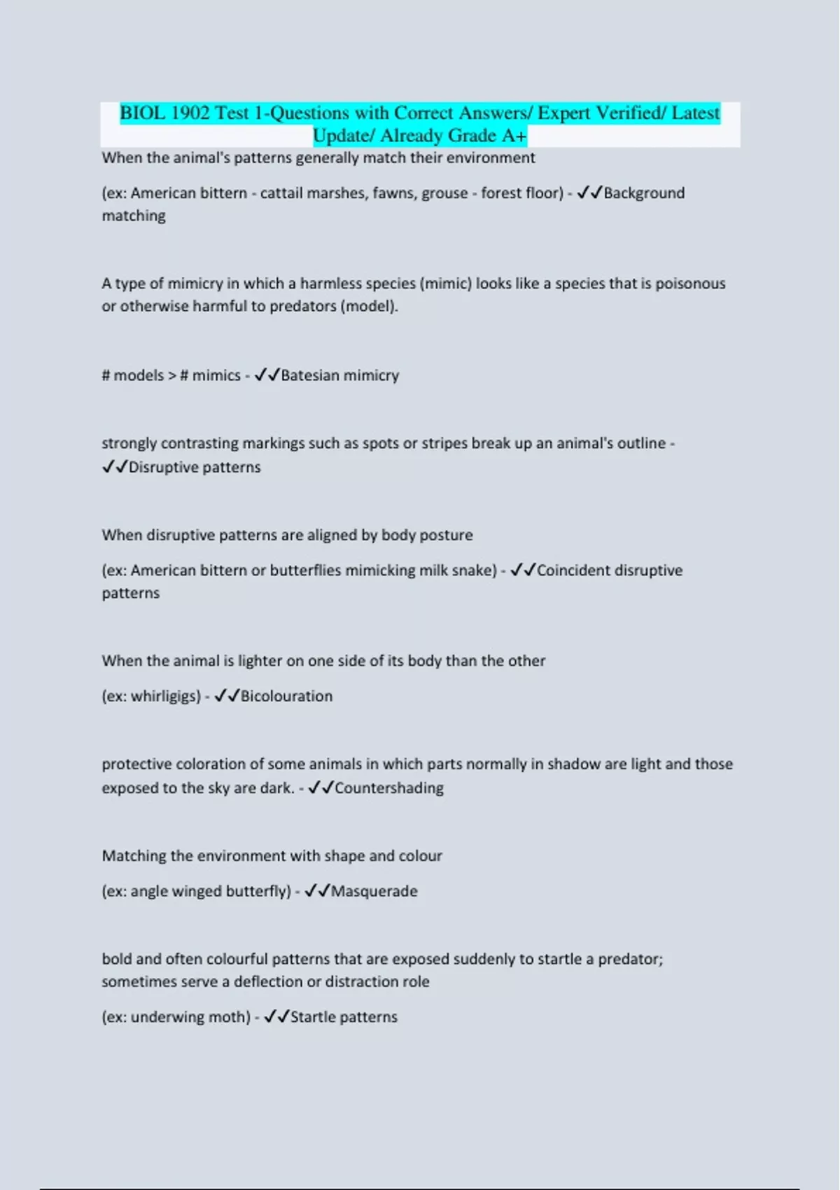BIOL 1902 Test 1-Questions with Correct Answers/ Expert Verified/ Latest Update/ Already Grade A+
