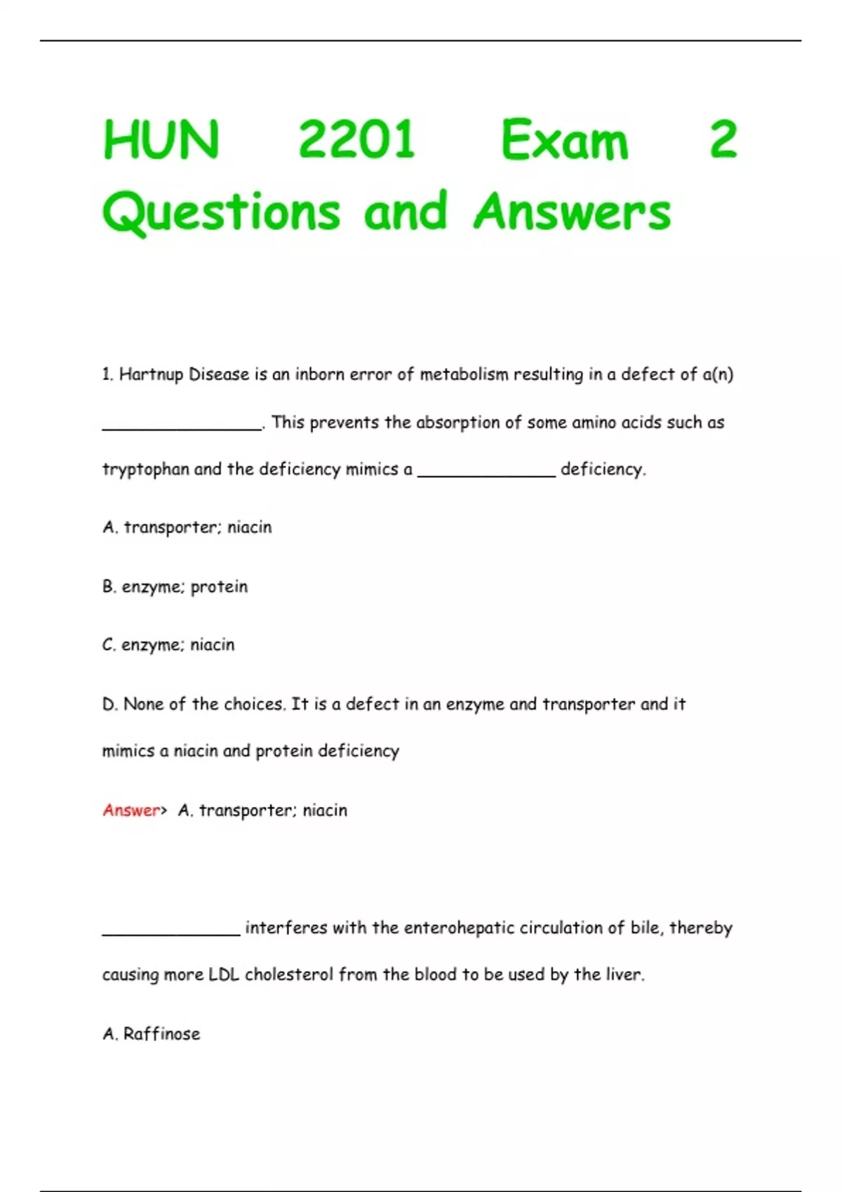 1. Hartnup Disease is an inborn error of metabolism resulting in a defect of a(n) _______________. This prevents the absorption of some amino acids such as tryptophan and the deficiency mimics a _____________ deficiency. A. transporter; niacin B. enzyme; protein C. enzyme; niacin D. None of the choices. It is a defect in an enzyme and transporter and it mimics a niacin and protein deficiency Answer> A. transporter; niacin _____________ interferes with the enterohepatic circulation of bile, thereby causing more LDL cholesterol from the blood to be used by the liver. A. Raffinose B. Insoluble fiber C. Soluble fiber D. Protein E. Amylopectin Answer> C. Soluble fiber. This may lower "bad" cholesterol in the blood. The following is/are necessary for triglyceride digestion and absorption EXCEPT? A. None of the choices. All are required for the triglyceride digestion and absorption. B. CCK C. Large intestine (colon) D. Bile E. Pancreatic lipase Answer> C. Large intestine (colon) _________ can be obtained from food and help promote the activity of beneficial intestinal microbial bacteria in the gut. A. All choices are correct B. Raffinose C. Disinfectants D. Prebiotics E. Probiotics Answer> D. Prebiotics The following statements are true regarding the comparison of added sugars to either naturally occurring sugars or natural sweeteners. Except: A. Food sources of naturally occurring sugars higher in fiber, vitamins, and minerals B. Added sugar consumption may lea